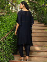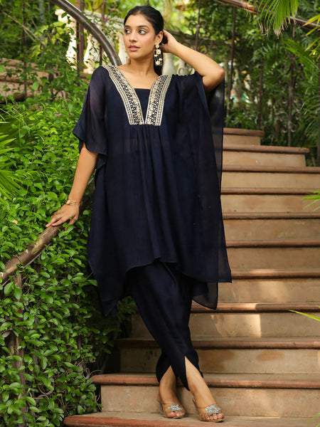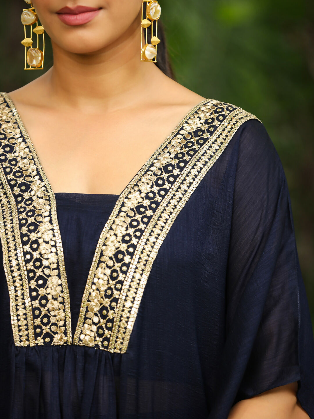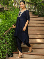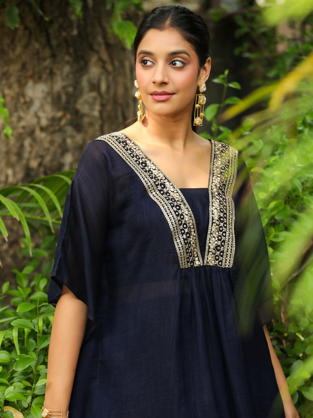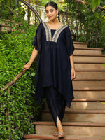 Janasya Navy Blue Silk Blend Yoke Embroidery Co-Ords - XS