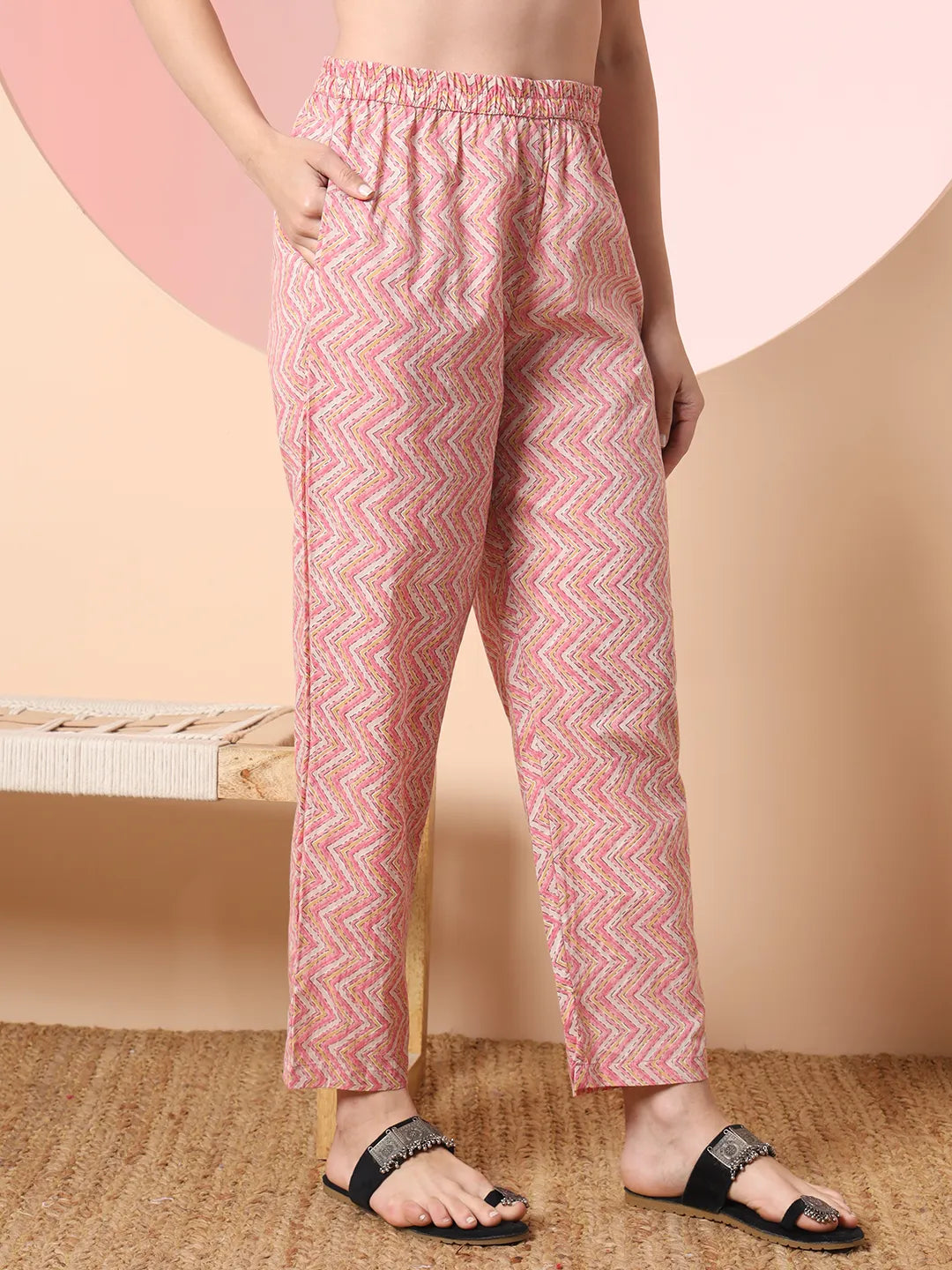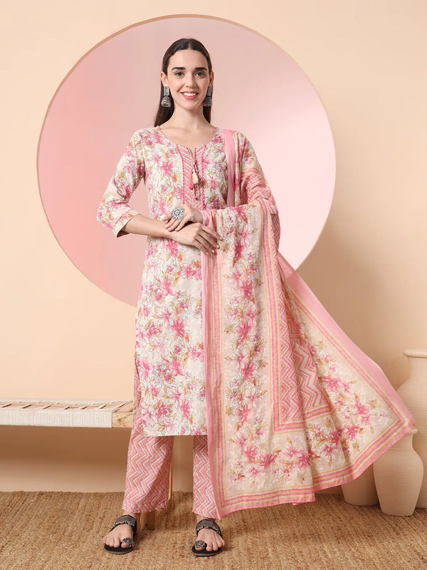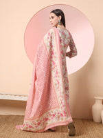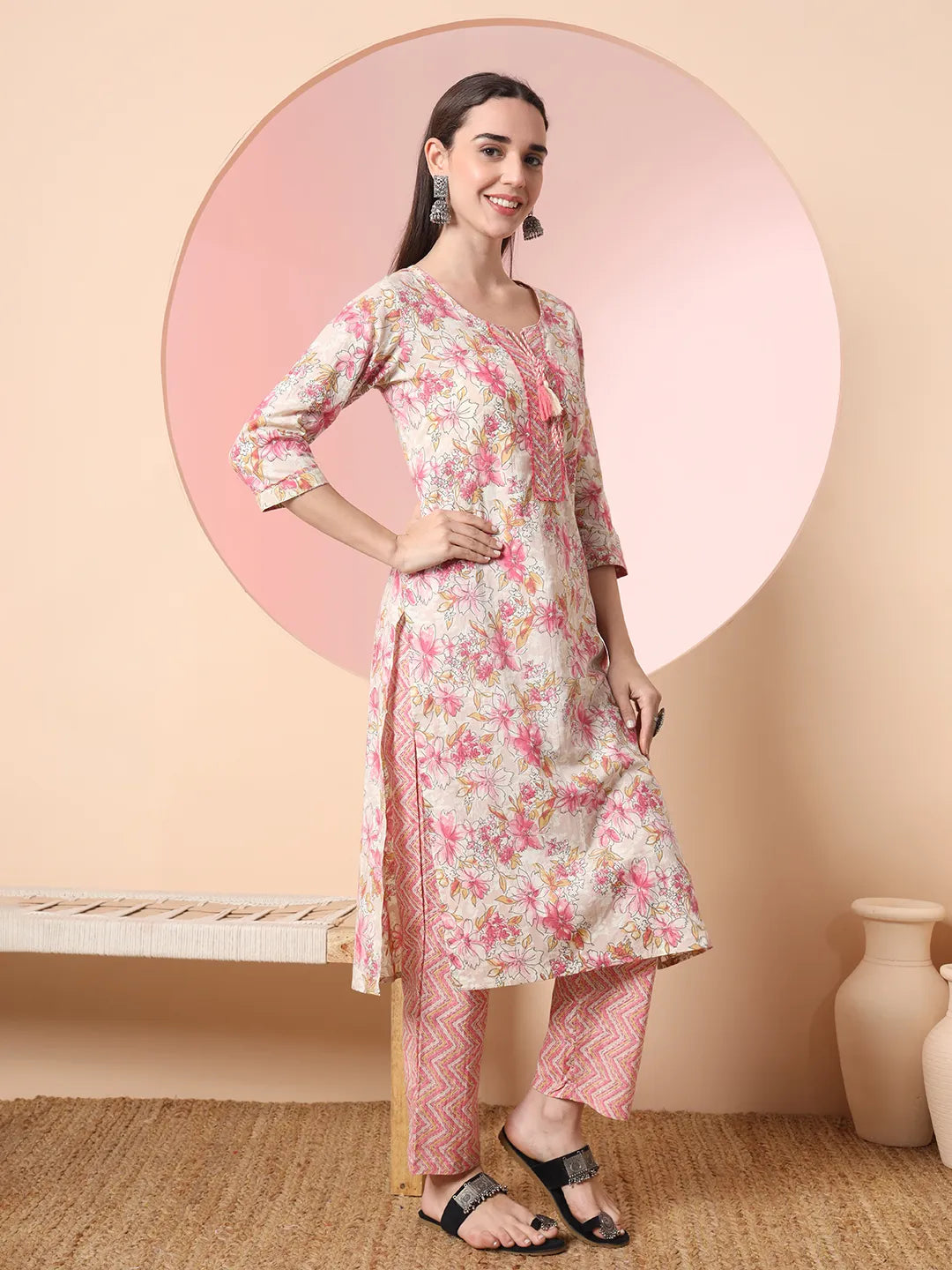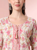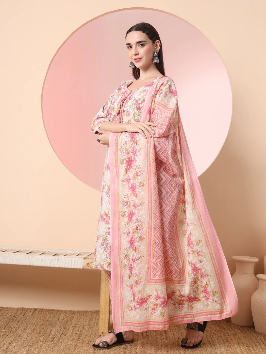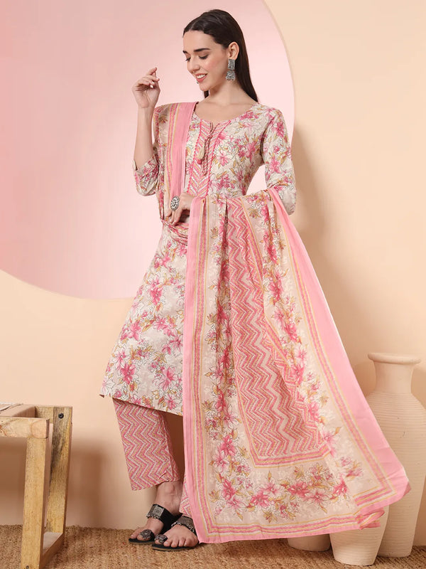 Cream, pink, yellow printed Kurta with Trousers with Dupatta