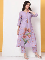 Yufta Lavender Linen Cotton A Line Kurta Dupatta Pant Set Product Details  Lavender Floral,Kantha_Work kurta Trouser Dupatta Set, Kurta Design Kan...