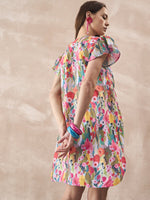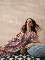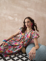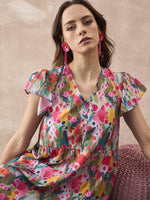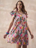 This multi-floral V-neck short dress brings together a variety of colorful blooms for a lively, fun aesthetic. The flattering V-neck design enhances the silhouette, while the playful flower pattern adds charm and energy. Ideal for a casual day out or a garden party, this dress is a perfect mix of femininity and freshness.