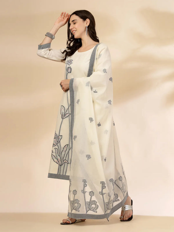 Yufta Off White Handloom Cotton Jacquard Sequins Work Kurta Dupatta Pant Set - M