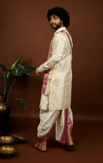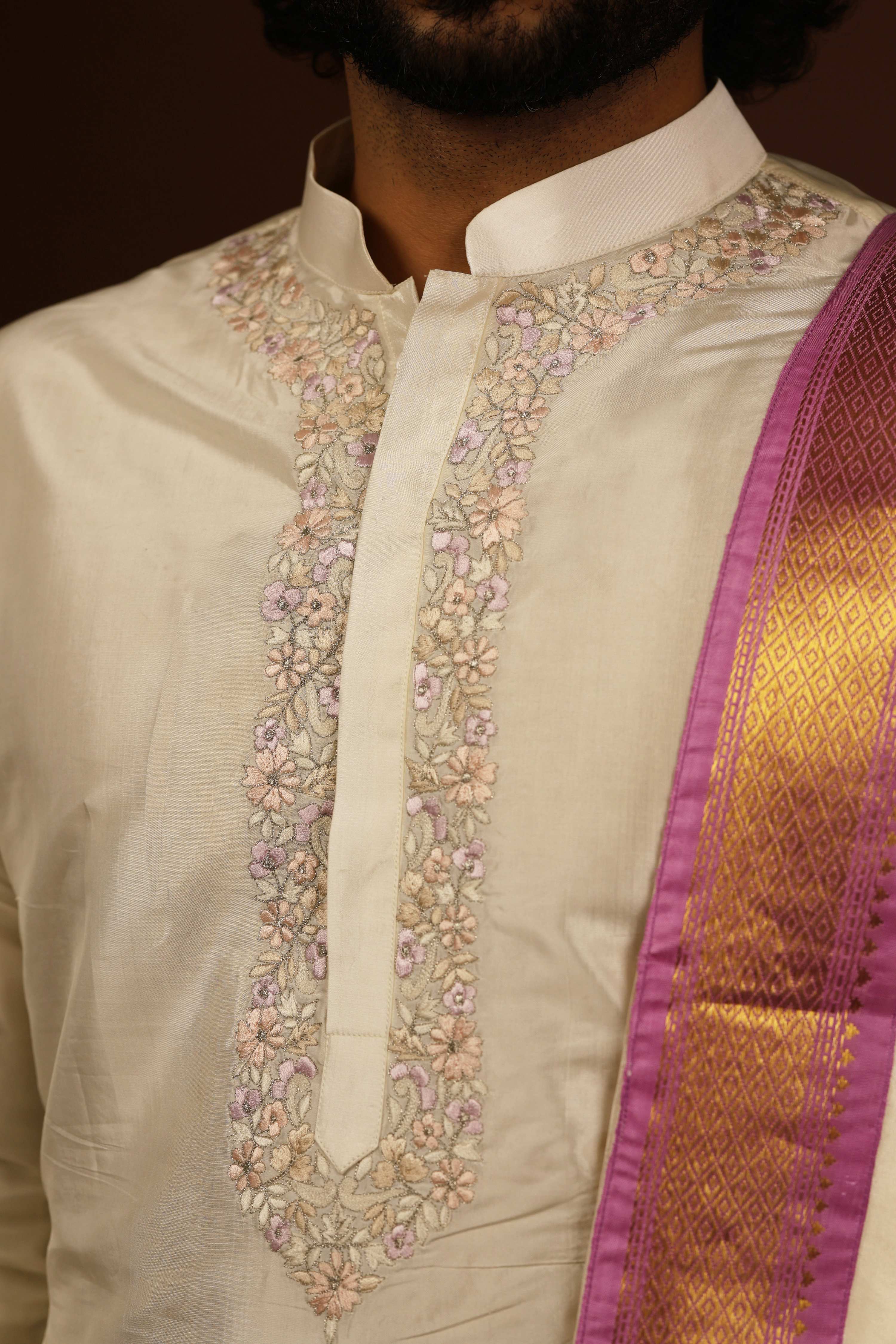 Elevate your style with our majestic Off-White Pattu Kurta Set. Crafted from luxurious pattu fabric, the kurta exudes timeless elegance. Delicate pastel shades of embroidery add a touch of sophistication, making it perfect for special occasions. Experience refined craftsmanship and effortless grace with our exquisite Pattu Kurta Set.