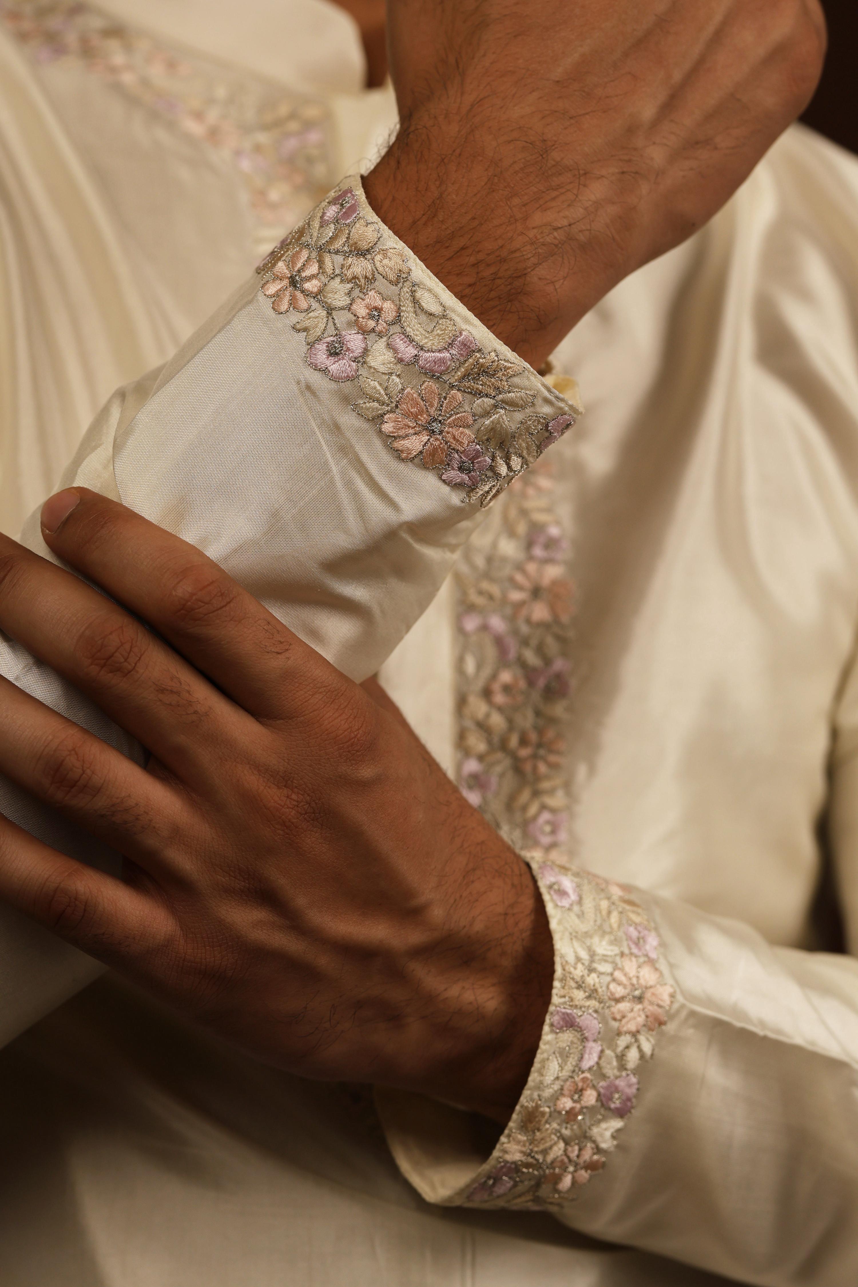 Off White Machine Embroidered Majestic Pattu Kurta Set by Hilo Design