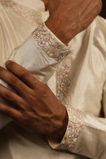 Off White Machine Embroidered Majestic Pattu Kurta Set by Hilo Design - XS