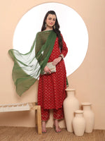 Yufta Pure Cotton Red Anarkali Kurta Dupatta Set - M