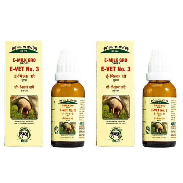 • E-Milk Gro Drops is for cattle who have decreased milk production and/or suffer from irregular or under-developed udders. It helps correct any underlying condition that the cattle may be facing and help in the udder growth. E-Milk Gro Drops also help increase milk production.