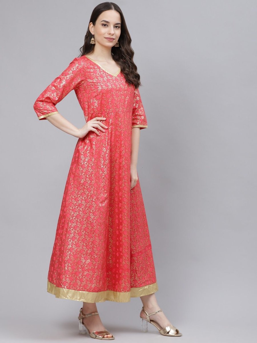 AURELIA Coral Pink & Golden Ethnic Motifs A-Line Maxi Dress Product Details Coral pink and golden ethnic motifs print a-line dress V-neck ...