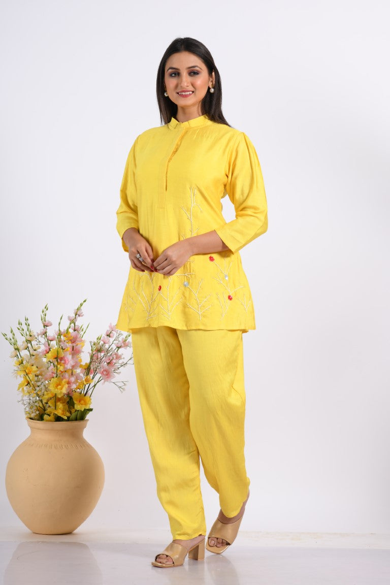 Morchari Co Ord Set With Hand Embroidery - Yellow - Distacart