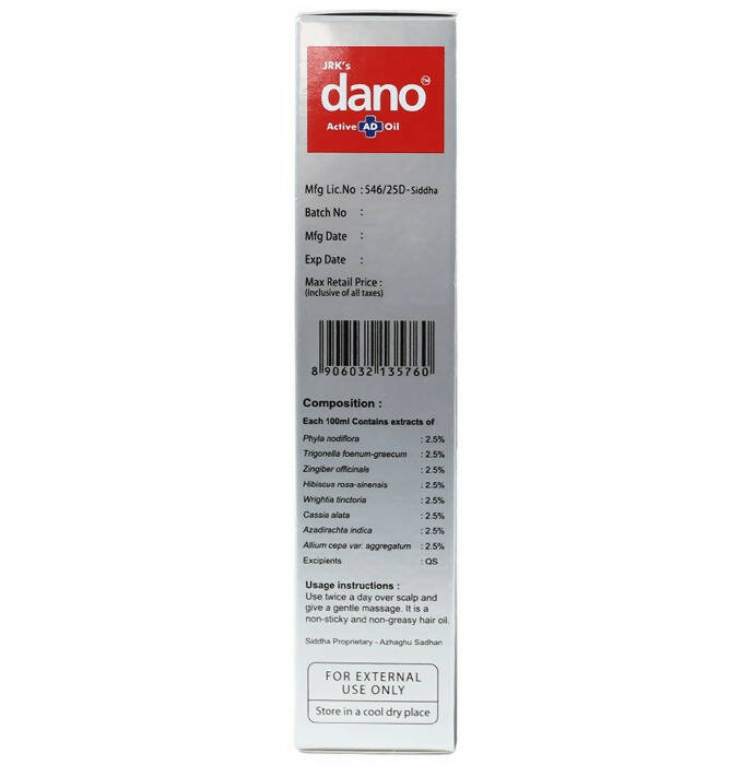 • JRK's Dano active AD oil, is an advanced anti-dandruff formulation to address drug-resistant dandruff. Formulated with a combination of powerful anti-dandruff herbal active.