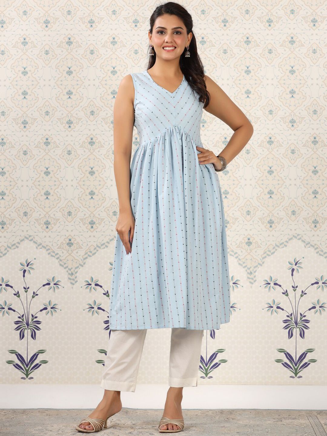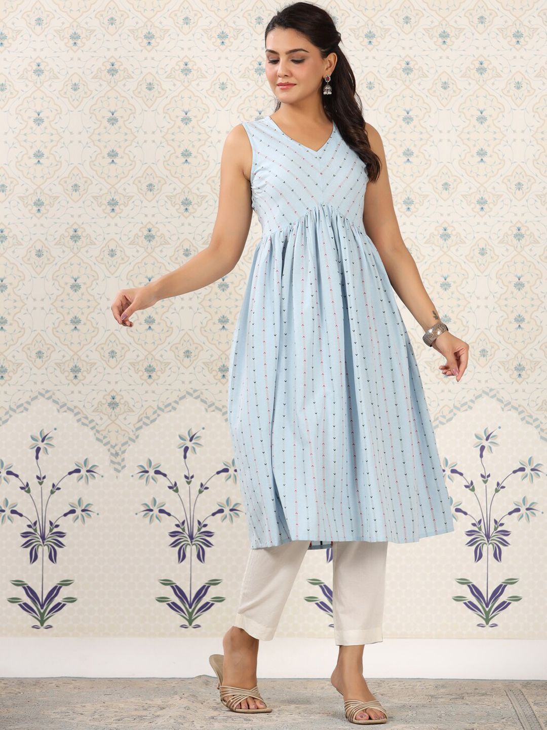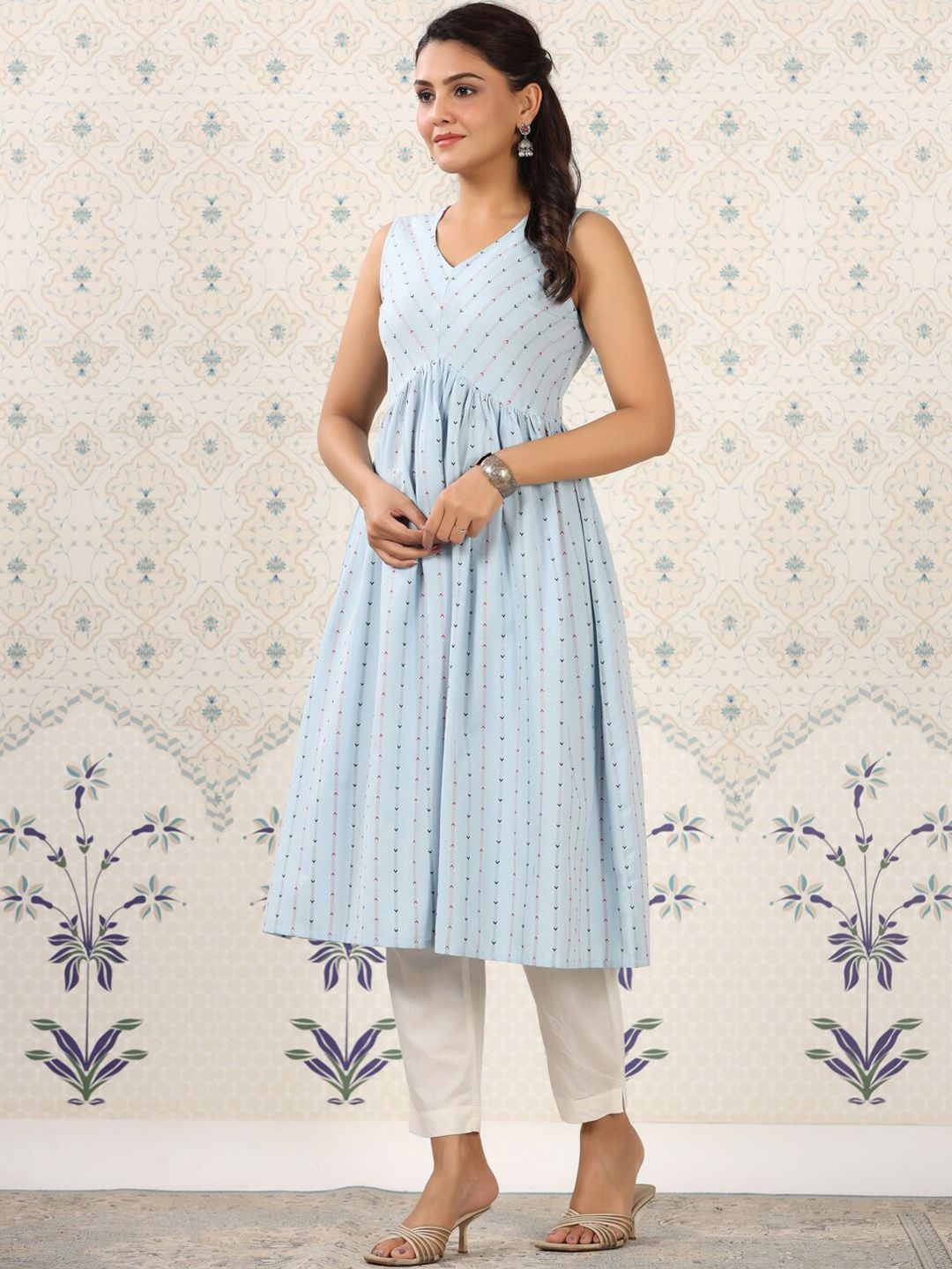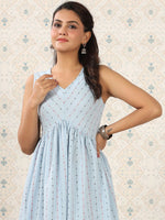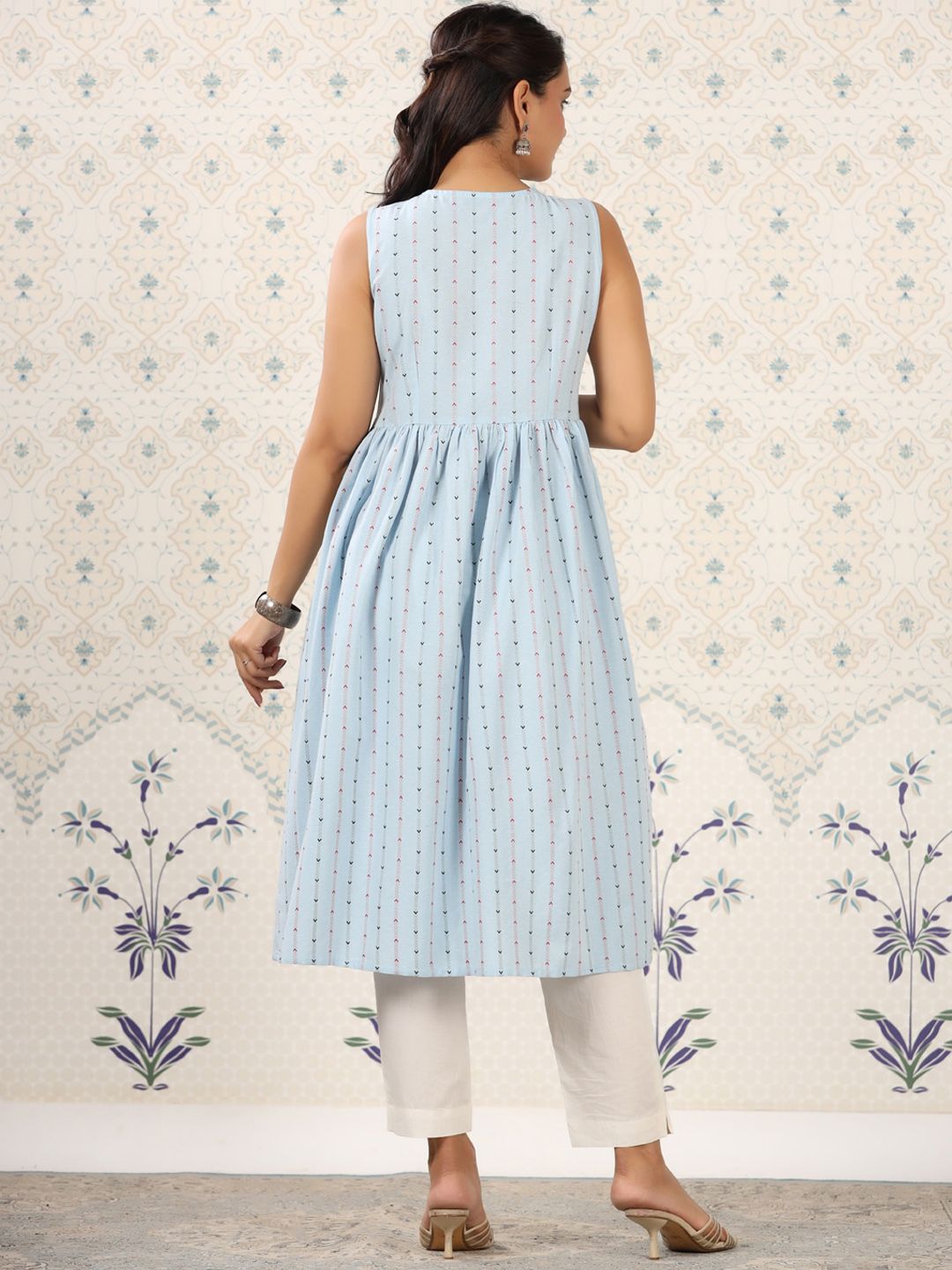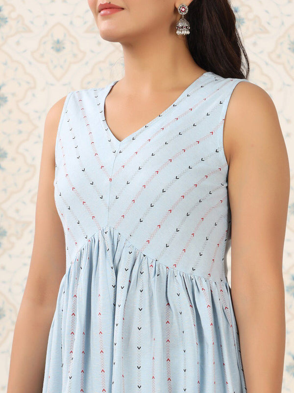 Ode by House of Pataudi Blue Geometric Printed A-Line Kurta Product Details Colour: blue Geometric printed V-neck Sleeveless A-line shape with...