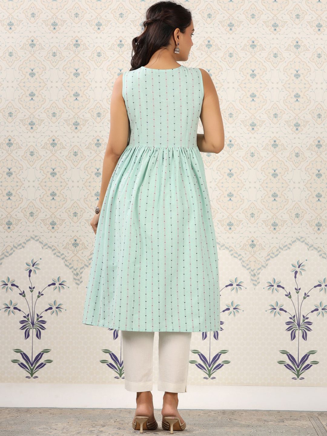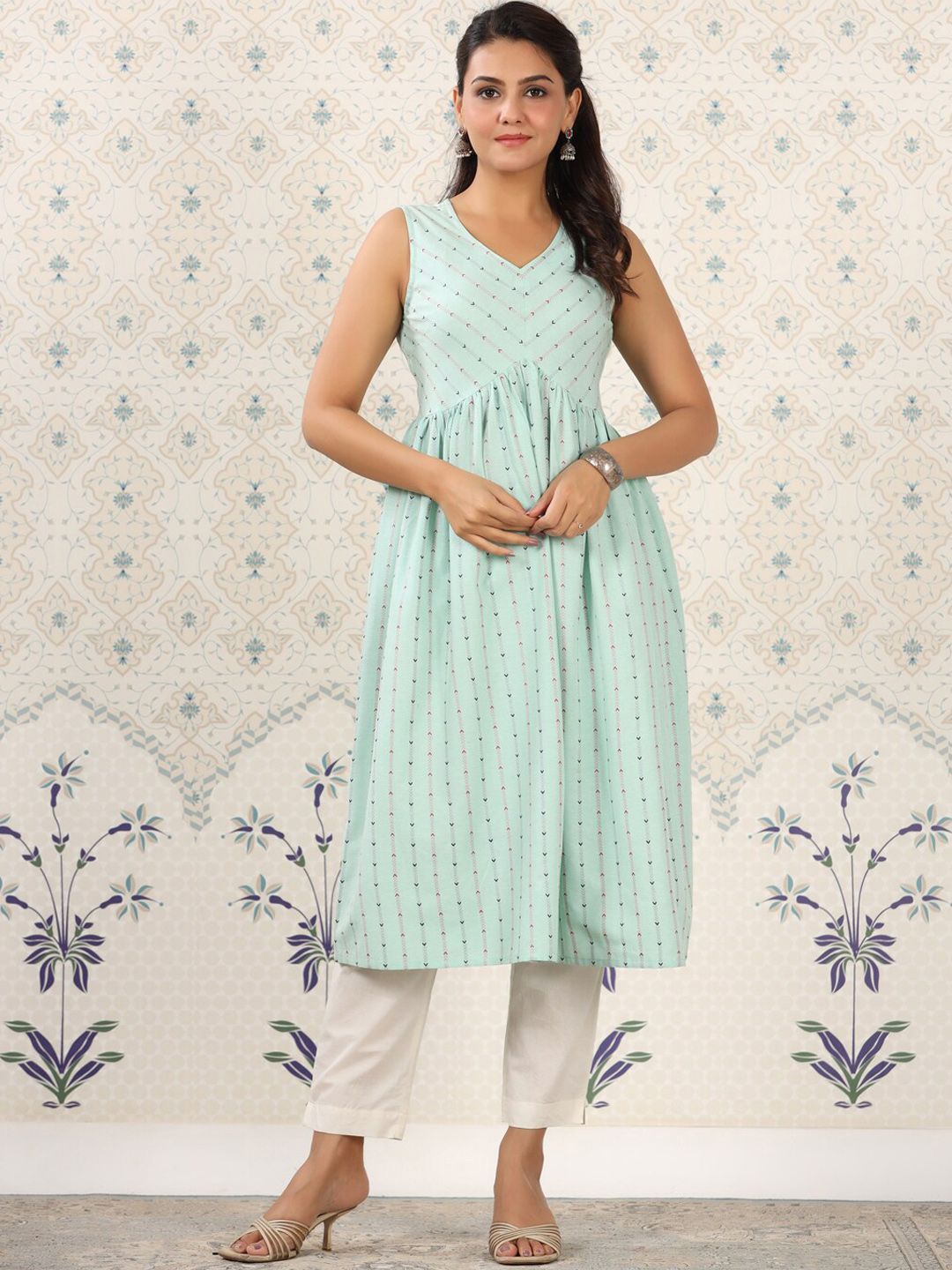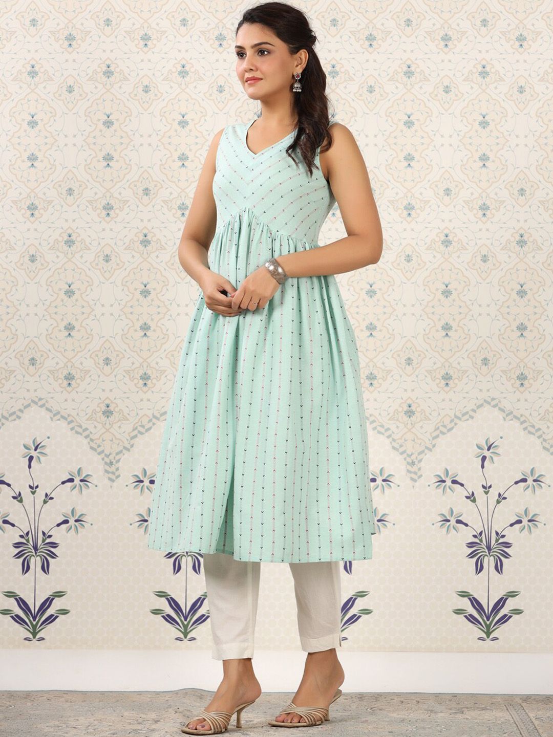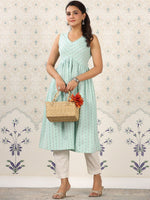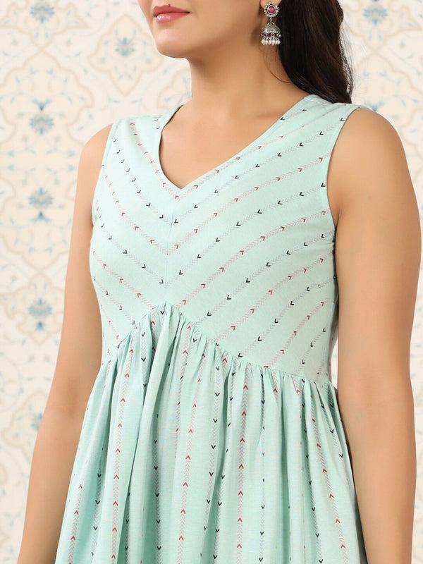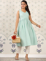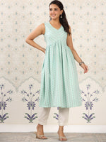 Ode by House of Pataudi Green Geometric Printed A-Line Kurta Product Details Colour: green Geometric printed V-neck Sleeveless A-line shape wi...