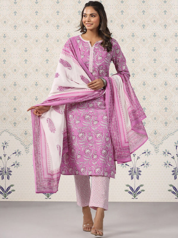 Ode by House of Pataudi Printed Notched Neck Pure Cotton Kurta With Trousers & Dupatta Product Details Lavender & white printed Kurta wi...