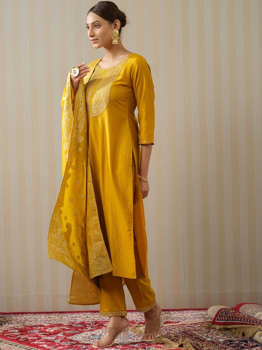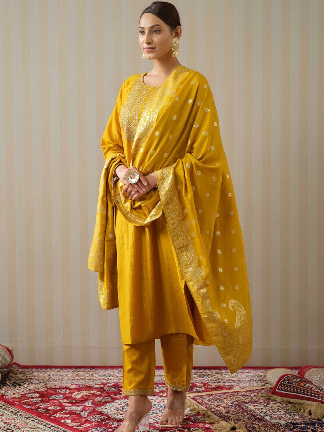 Ode by House of Pataudi Yellow Ethnic Motifs Straight Kurta & Trousers With Dupatta Product Details Yellow embroidered Kurta with Trousers w...