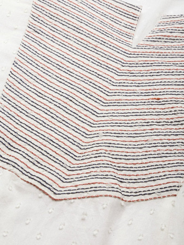 White A-line calf length kurta, has a round neck, three-quarter sleeves, flared hem