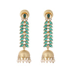 22k gold-plated elegant gold-tone jhumki earrings with cascading green stones and pearl accents. A perfect blend of tradition and modern charm for festive occasions. Secured with a post and back closure.
