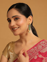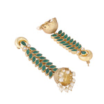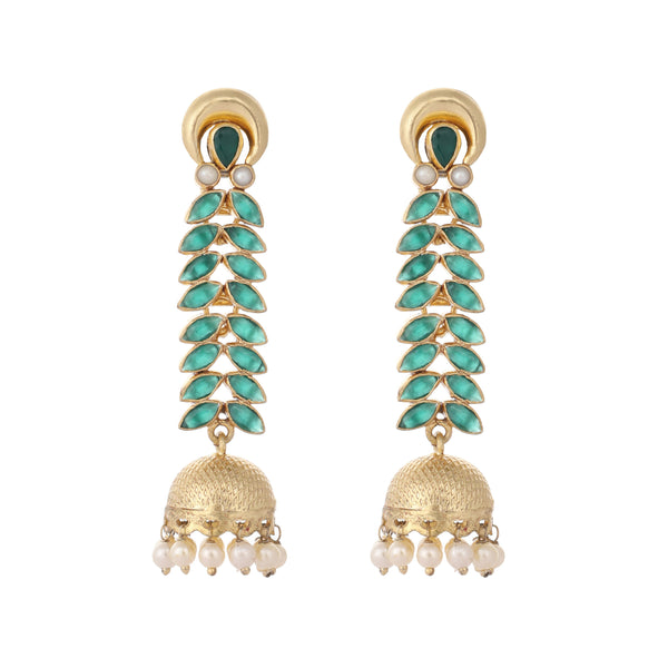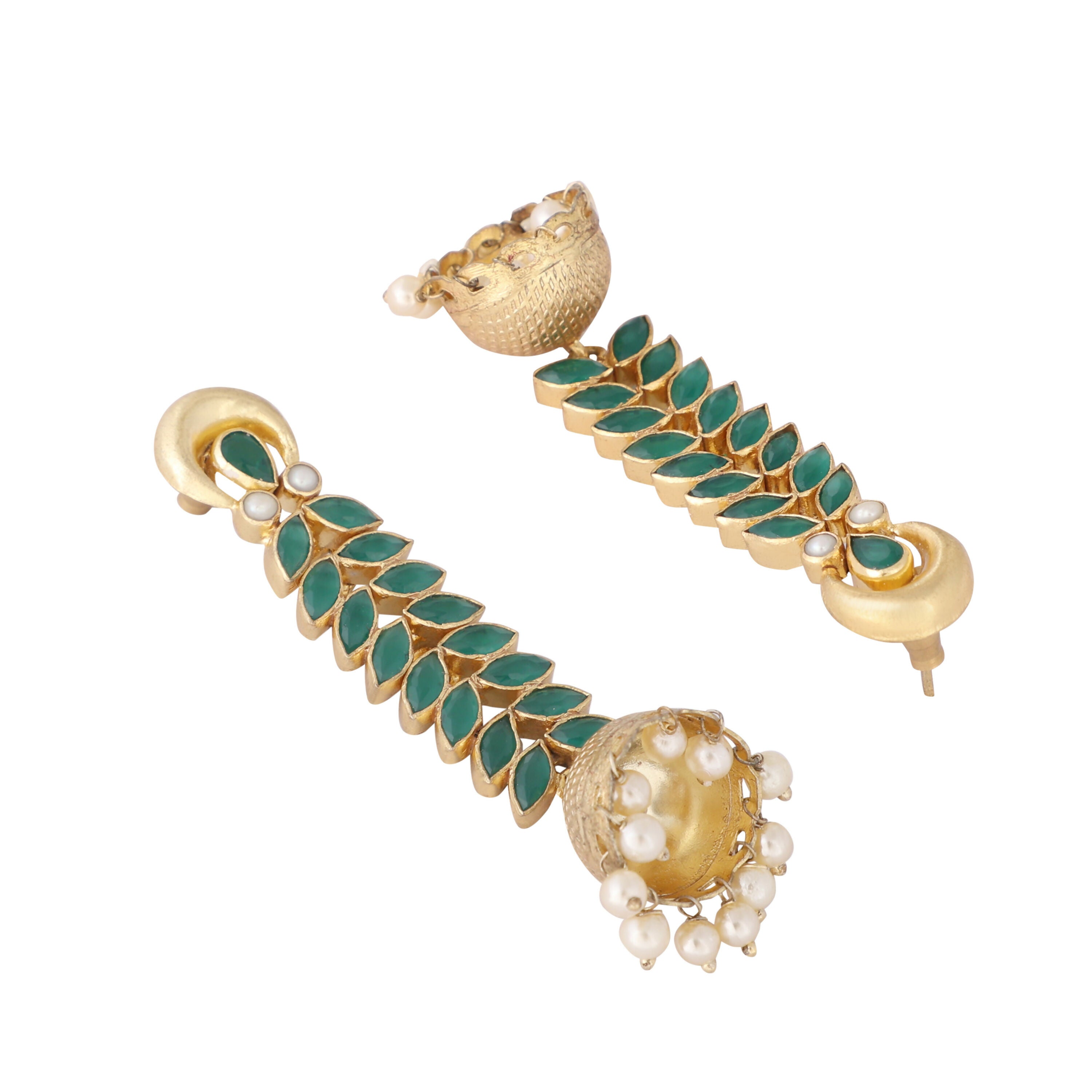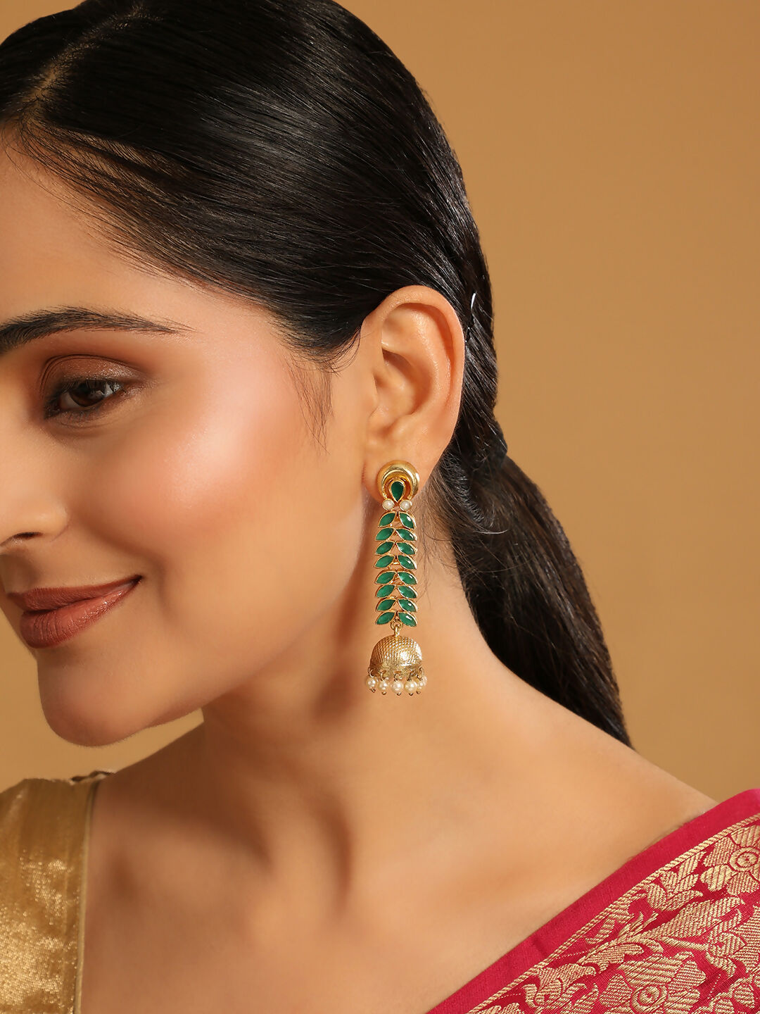 Nuyug 22K Gold Plated Green Fern EarringsAbout the product:22k gold-plated elegant gold-tone jhumki earrings with cascading green stones and pearl ...