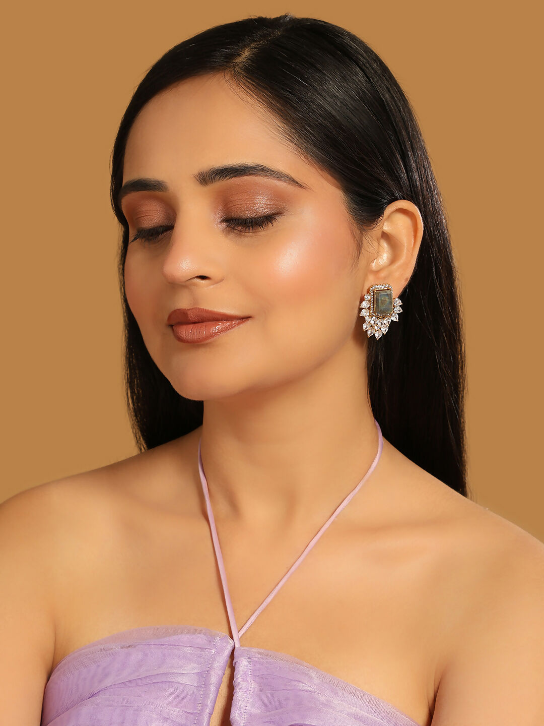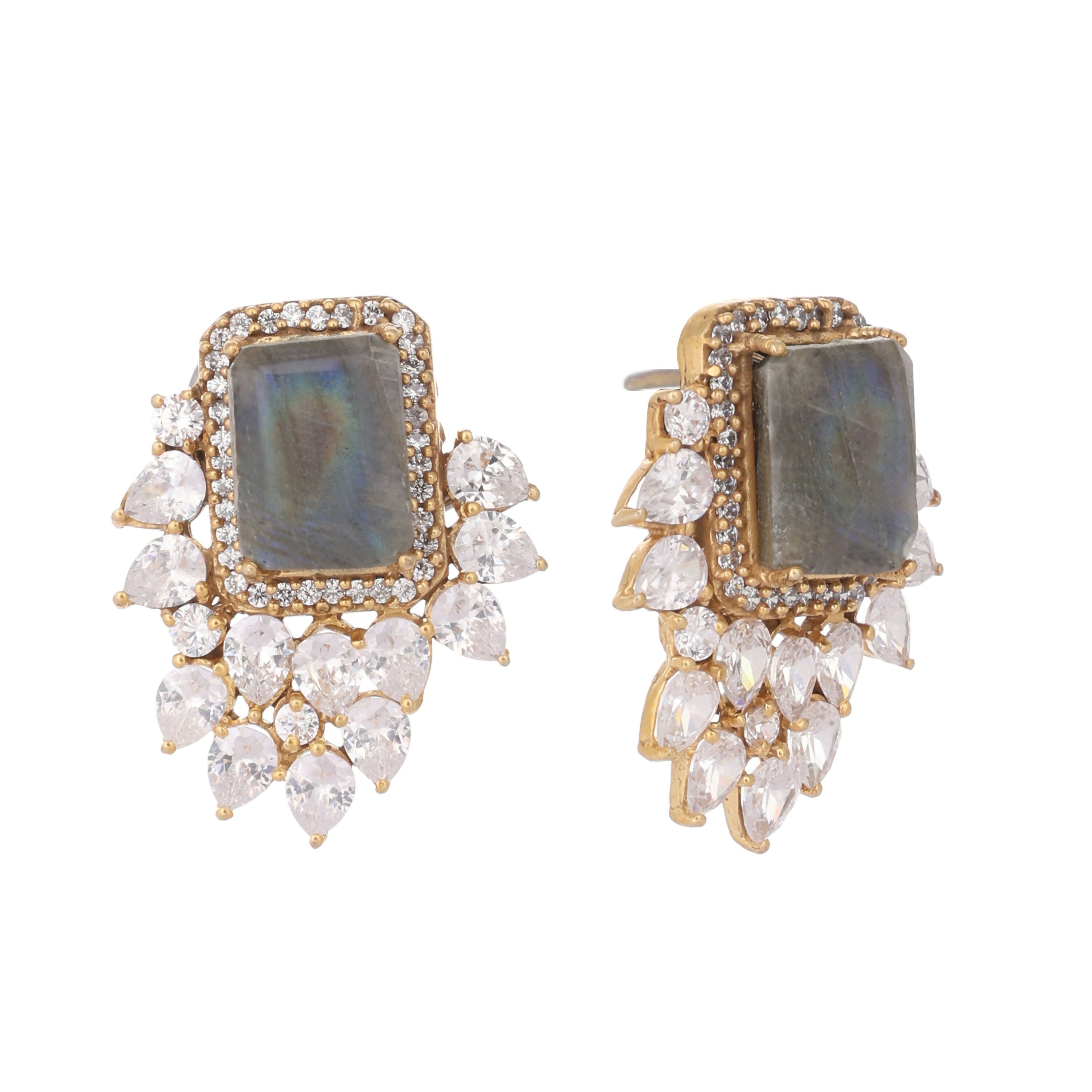 22K Gold-toned contemporary shaped studs, gold-plated, has Labradorite stone with zircon studded details. Secured with a post and back closure. This comes with anti-tarnish and hypoallergenic for lasting shine and comfort.