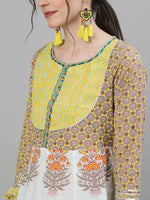 Mustard Yellow and grey A-line calf length kurta, has a round neck, three-quarter sleeves, flared hem
