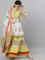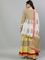 Mustard Yellow and grey printed kurta with skirt