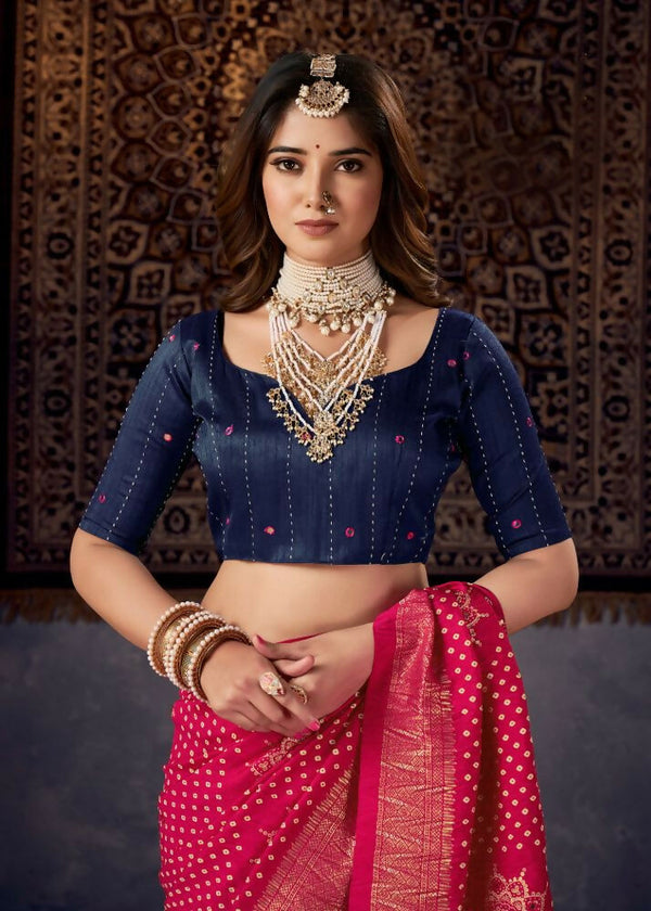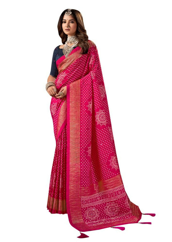 Joban Fashion Rani Dola Silk Foil Print Zari Border Work SareeAbout the Product: Color:Rani Occasion:Rajasthani Traditional Wear Work:Mirror Wor...