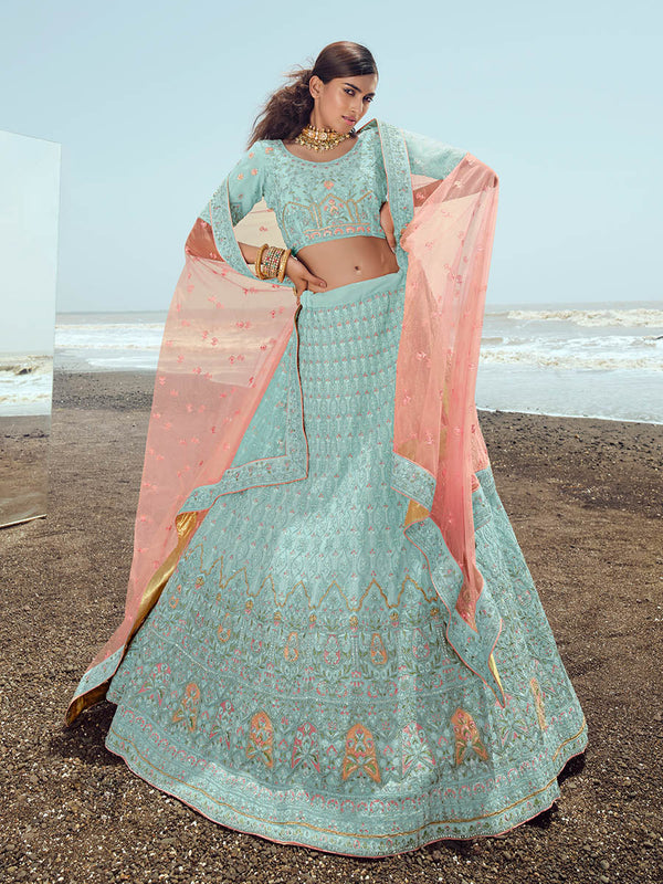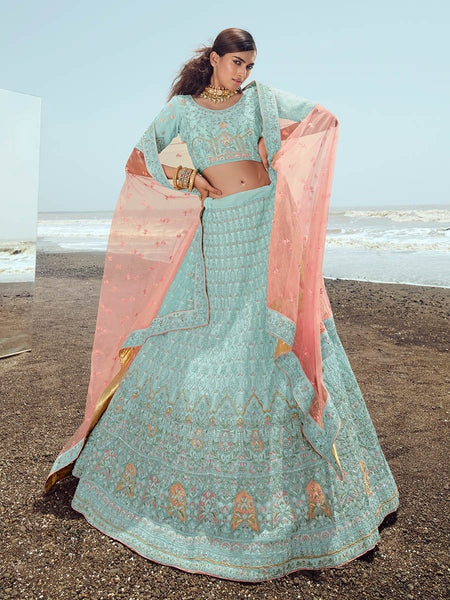 Myra Turquoise Georgette Embroidered Designer Lehenga Choli - Distacart