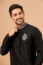 Hilo Design is featuring you black kurta in machine embroidery, embroidered near collar & motif at the chest ,which makes you look sassy and fashion forward . It can be worn for multiple occasions, from casual outings to festive occasions .pair it up with white or same colored bottoms.