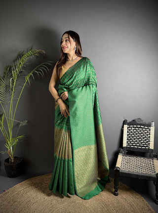 Joban Fashion Emerald Green Banarasi Soft Lichi Silk Checks & Woven Saree
