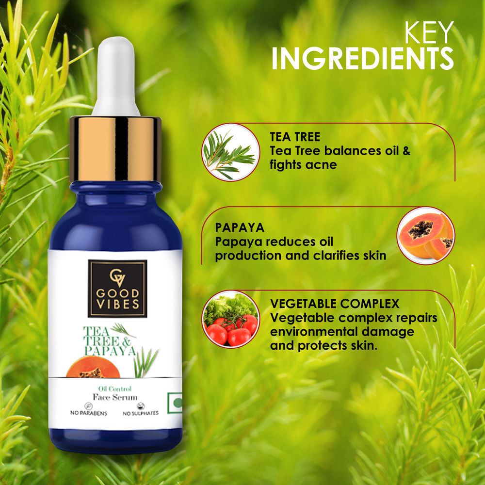 Reduce your sebum in the most effective way possible with Good Vibes Oil Control Serum. Infused with Tea Tree and Papaya extracts, it gives your skin the boost it needs. Tea Tree is extremely lightweight that helps combat blemishes and improves the overall condition of the skin. It helps your skin look clear. It also helps even out skin tone and improves its texture and reduces oiliness. Papaya helps accelerate cell turnover and speed up the production of fresher, younger cells. Together they give you a mattified look and oil-free skin with every use. For best results, use the serum as a part of your day and night routine