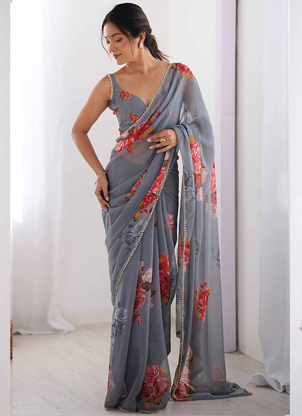Vegaa Fashion Grey Georgette Silk Printed Moti Work Border Designer Saree