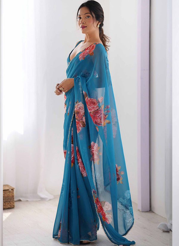 Vegaa Fashion Sky Blue Georgette Silk Printed Moti Work Border Designer Saree