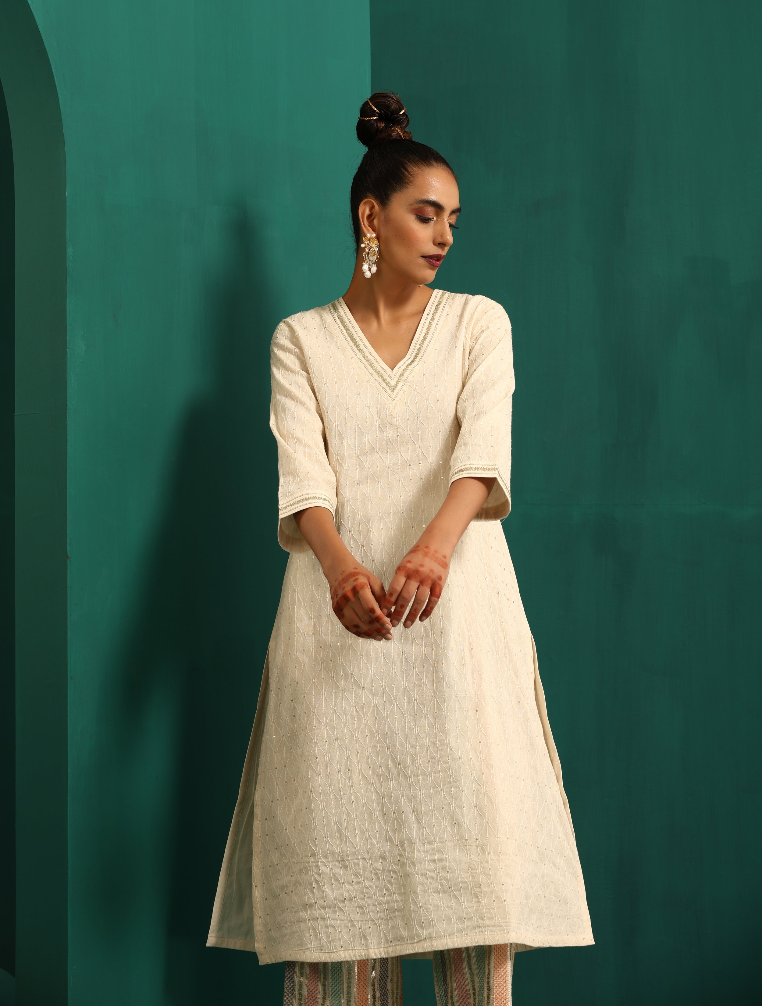 trueBrowns Ivory Tonal Cotton Kurta with Embroidered PantsDescription Cotton embroidered V Neck Kurta with Multicoloured embroidered pant. Paired w...