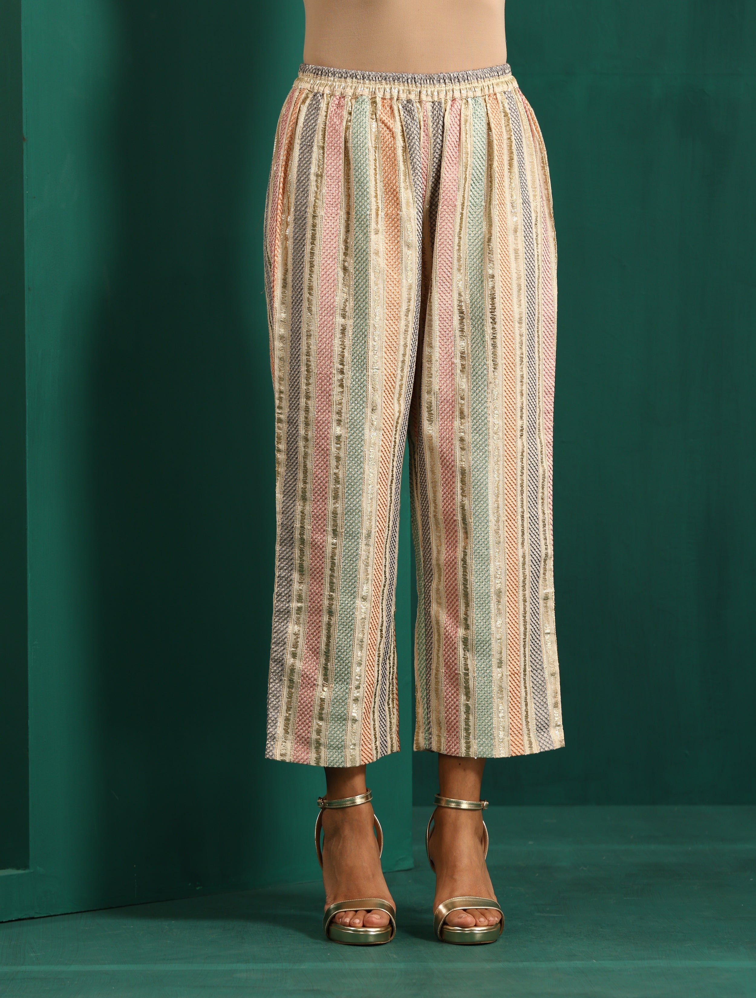 • Cotton embroidered V Neck Kurta with Multicoloured embroidered pant. Paired with elasticated waist pant. Style with pair of mules to complete the look.
