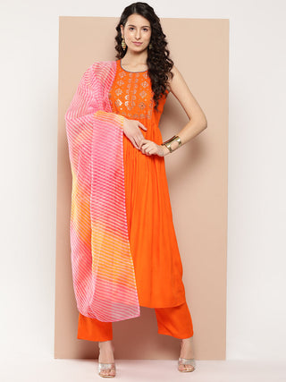 InWeave Women's Orange Mirror Work Aline Strappy Kurta Set W Pink Yellow Leh Dupatta