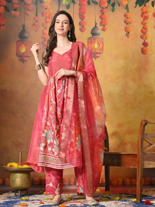 Myshka Women Pink Embroidered Kurta & Trousers With Dupatta