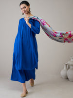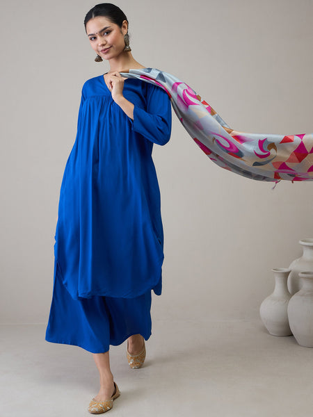 A graceful ink blue flared kurta featuring a flattering V-neckline, paired with a soft grey dupatta. The flowing silhouette adds a touch of elegance, ideal for festive gatherings or casual ethnic wear.