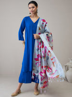 InWeave Ink Blue V Neck Flared Kurta Grey Dupatta Set - S