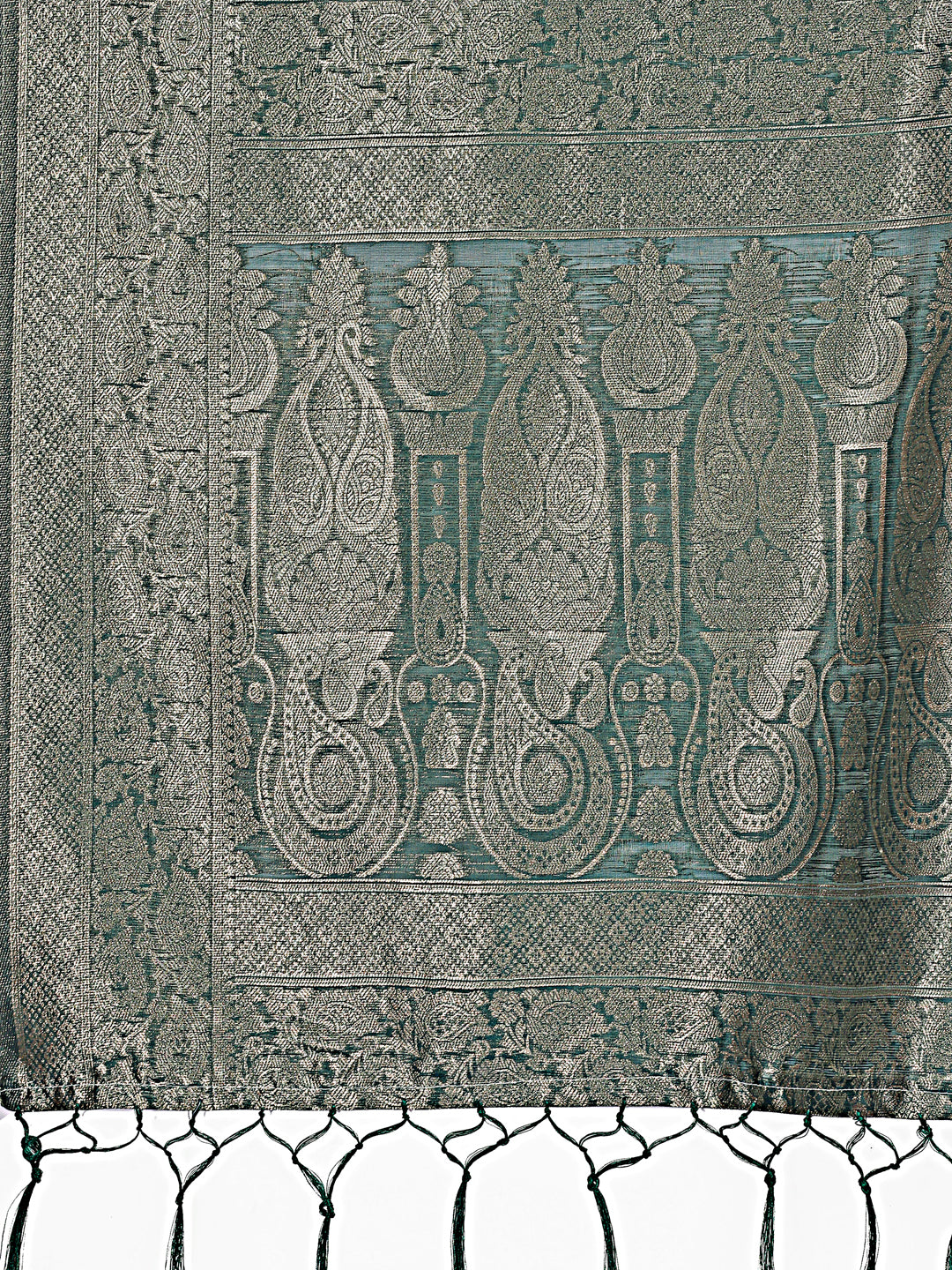 Grace meets grandeur with this luxurious Teal Lichi Silk Saree featuring intricate floral zari weaving throughout. Made from premium-quality silk blend, this saree exudes richness and tradition, perfect for festive occasions, weddings, and special events. The broad zari-woven border and ornate pallu with tassels add a royal finish to your ethnic look. Lightweight and easy to drape, this saree is accompanied by a matching blouse piece for a complete, sophisticated ensemble.