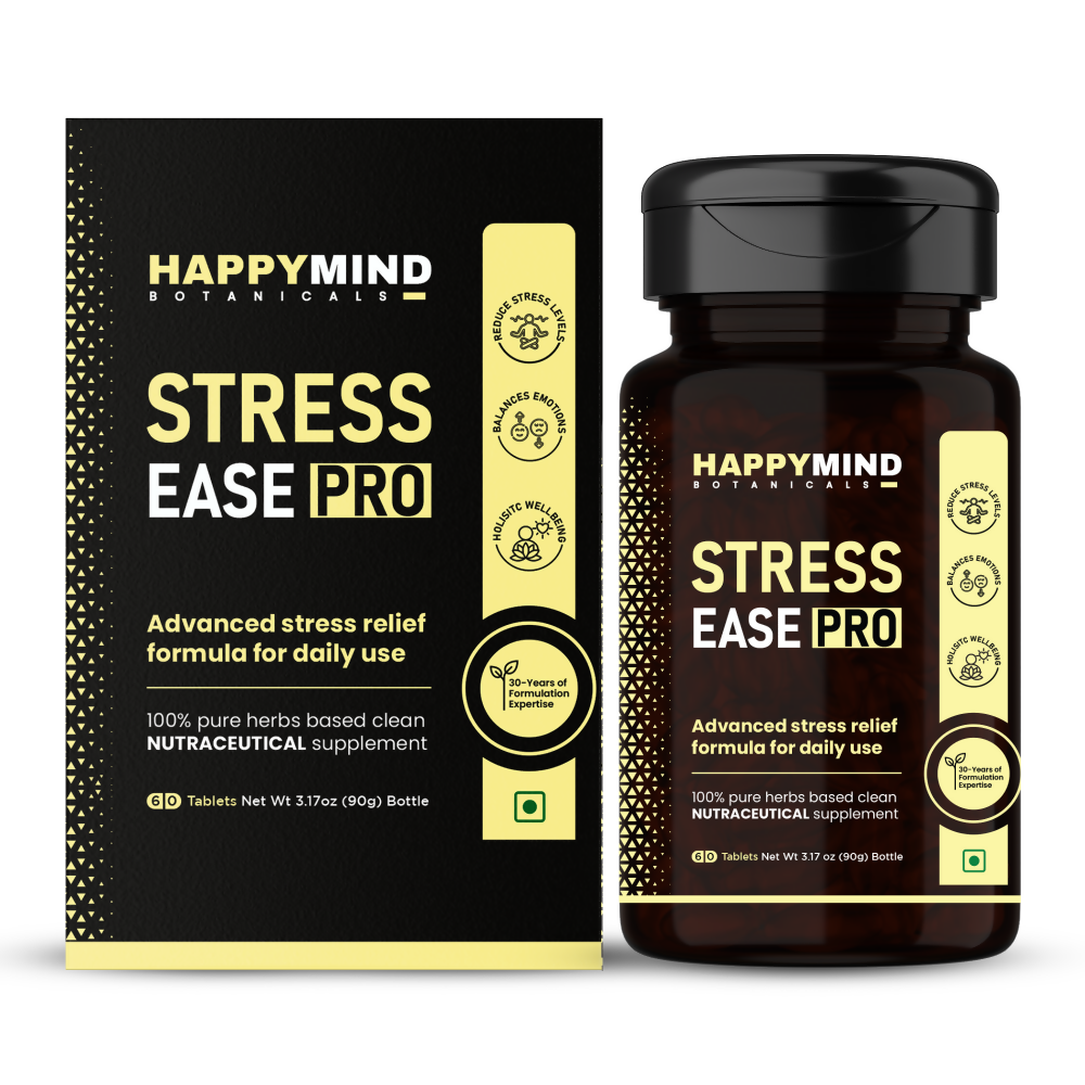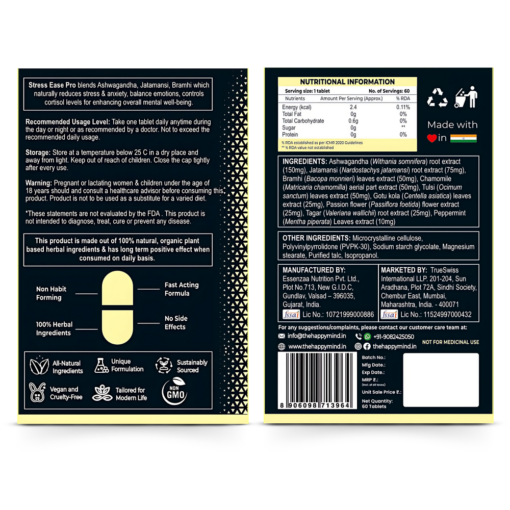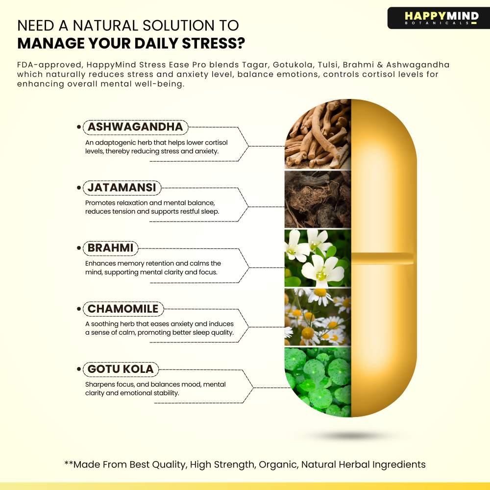 HappyMind Botanicals Stress Ease Pro Veg Tablets Ingredients: Ashwagandha, Brahmi, Chamomile, Gotu Kola, Passion Flower, Peppermint, Tulsi, and Tag...
