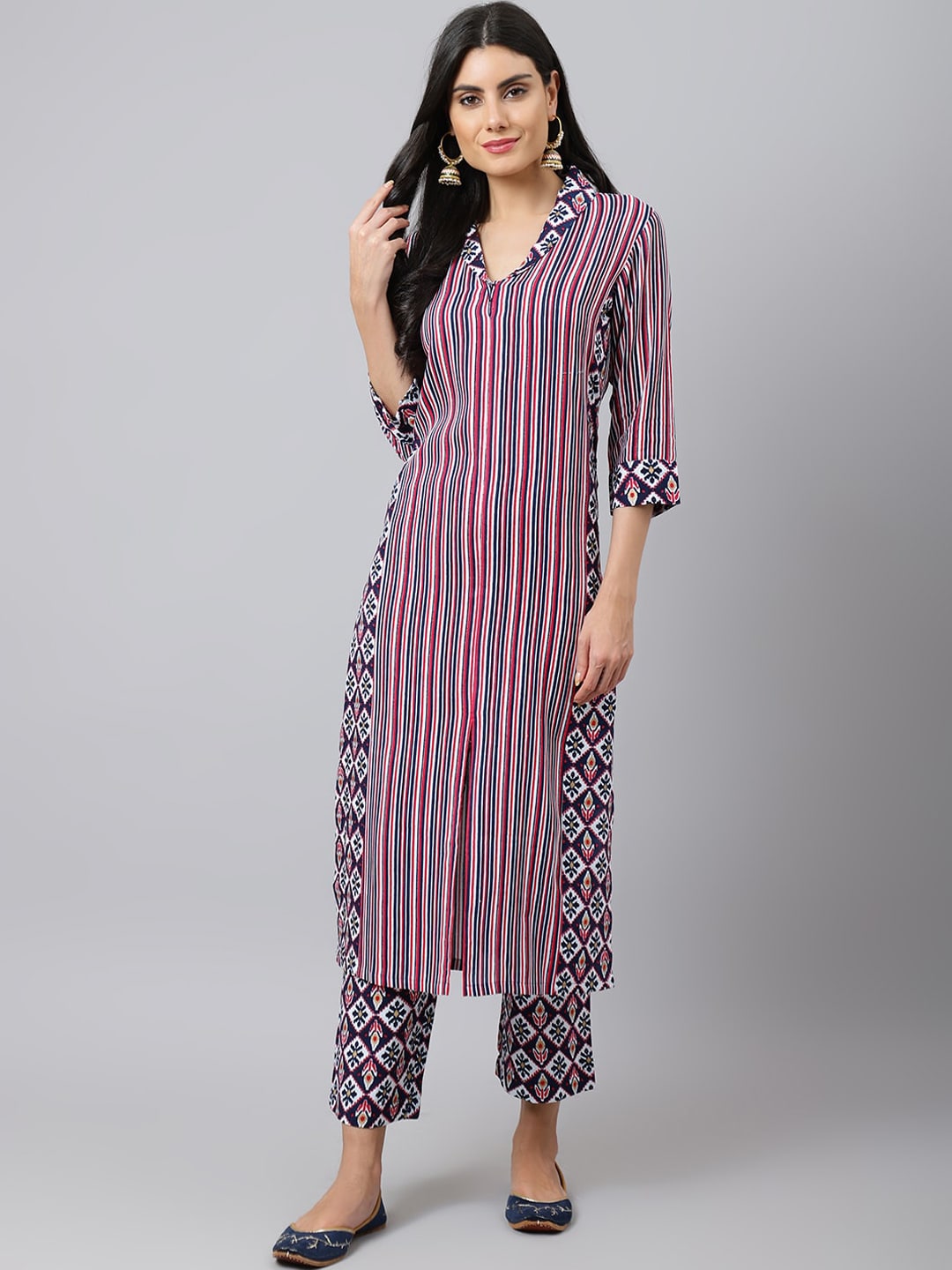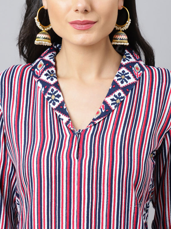 Khushal K Striped Shawl Collar Straight Kurta with Palazzos Product Details Navy blue & red printed Kurta with PalazzosKurta design: Strip...