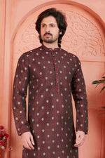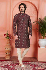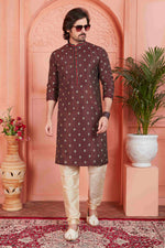 Raivat Ethnic Jacquard Silk Brocade Pintux Work Kurta Pyjama In Brown ColourAbout The productEnhance your traditional wardrobe with this stylish ku...