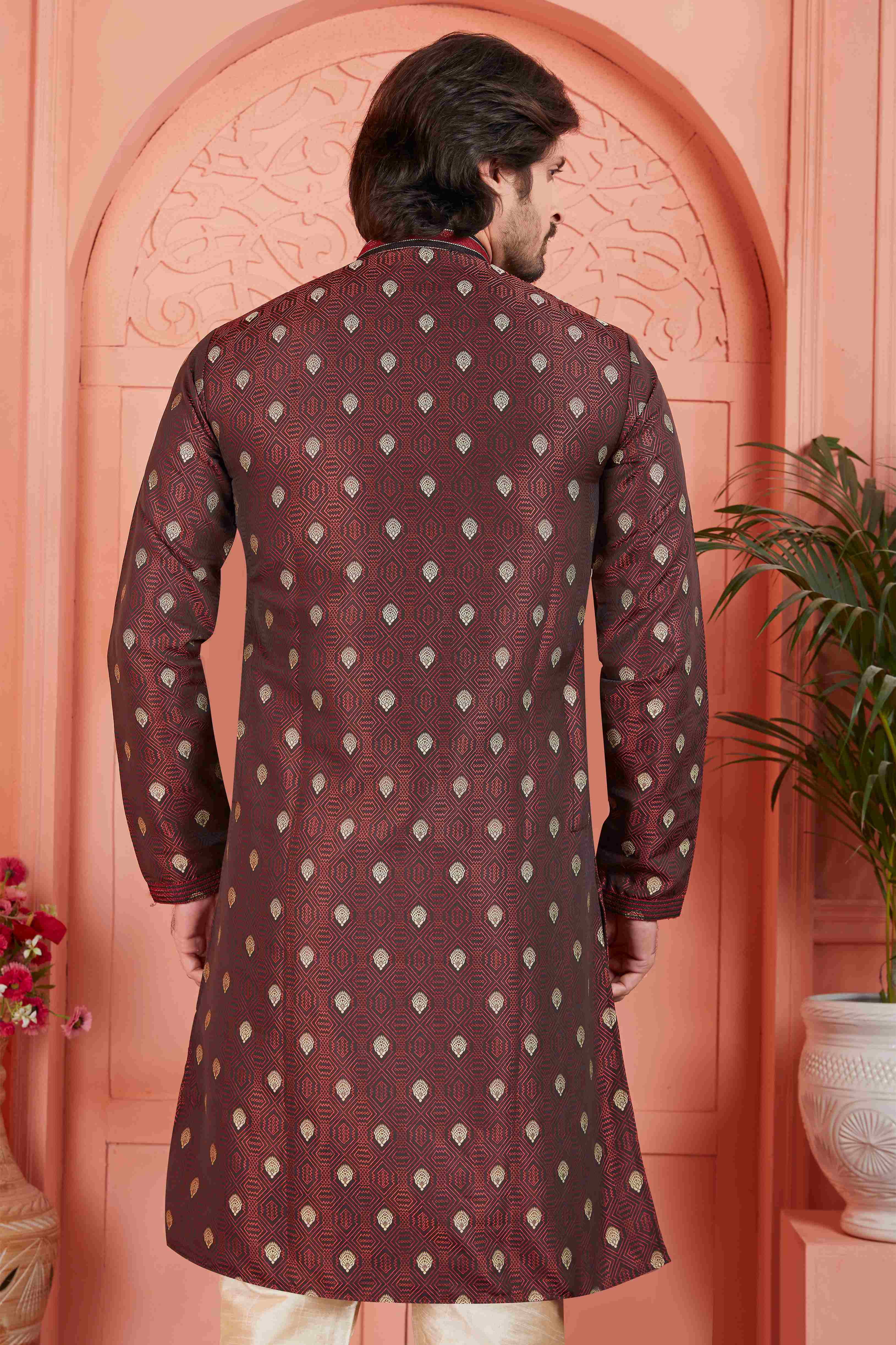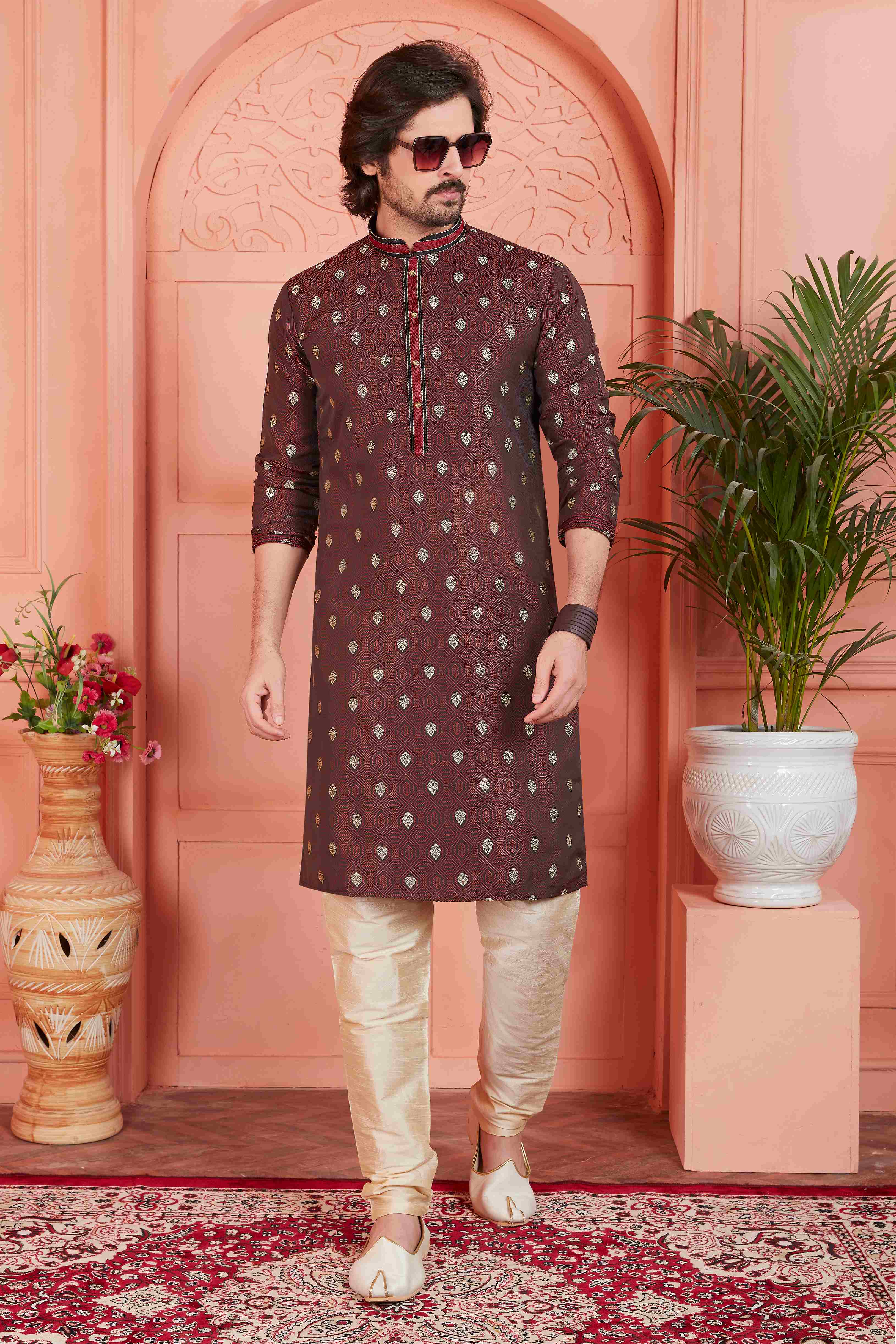 Raivat Ethnic Men's Jacquard Silk Brocade Pintux Work Kurta Pyjama In Brown Colour - 34