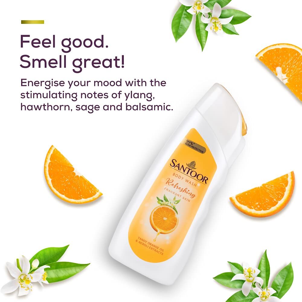 • Introducing New Santoor Bodywashes, made with organically grown aromatic ingredients which are combined by hand in small batches to make them sensorially rewarding. We take great care to watch what goes into each bottle. Rejuvenate your skin with Santoor Refreshing Skin Body Wash. Made with Tangy Orange Oil & Neroli Extracts, it simulates your skin giving it a youthful glow. Now, start your day feeling refreshed.