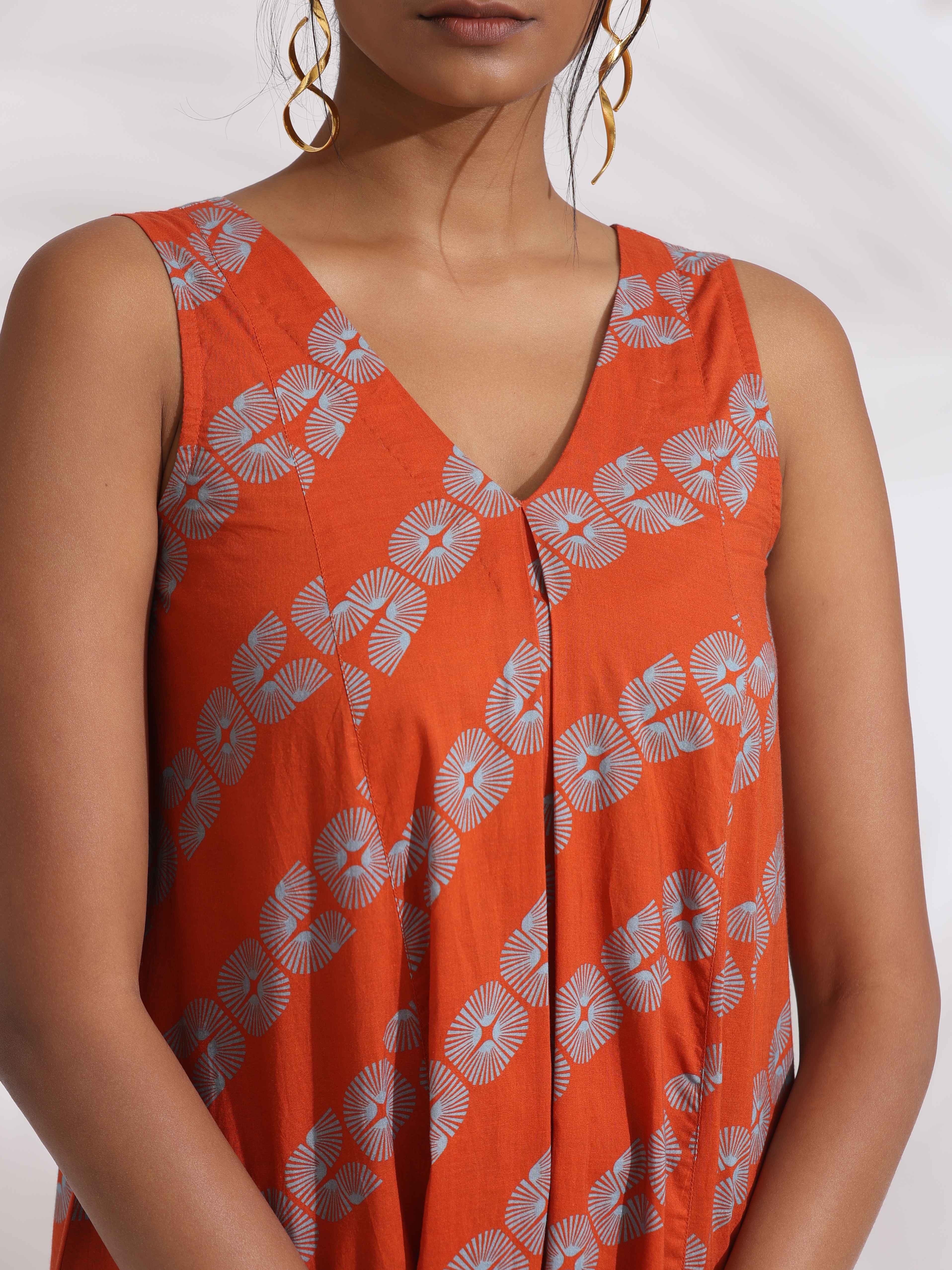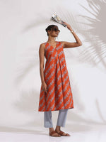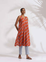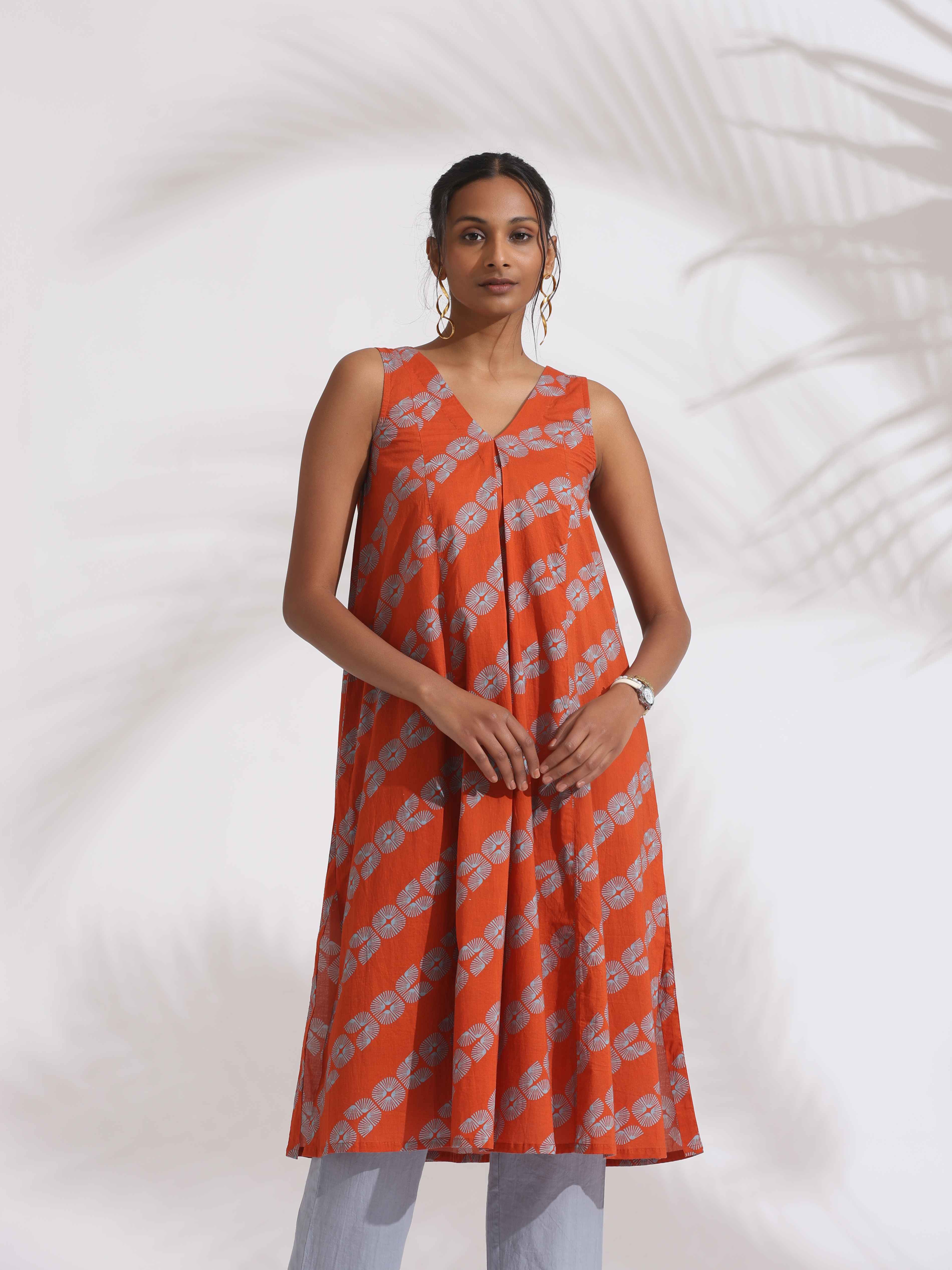 trueBrowns Orange Cotton Print Sleeveless Kurta Set - XS