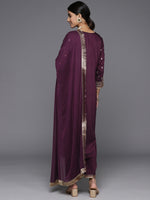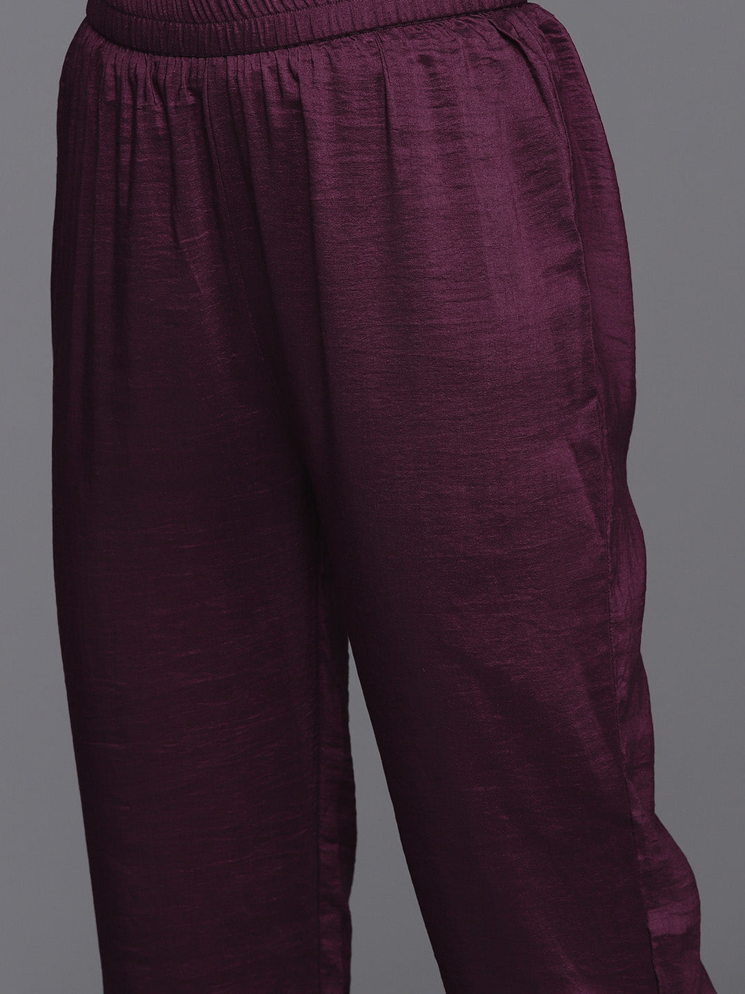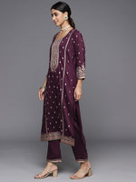 Burgundy Embridered Kurta Paired With Tonal Bottom And Dupatta With Four Side Fringed, Kurta Has V-Neck And Three Quarter Sleves, Straight Kurta With Side Slits