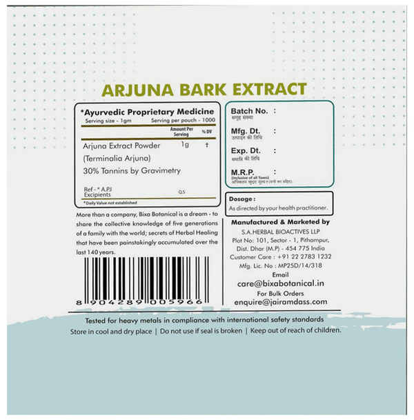 Bixa Botanical Arjuna Bark Extract Powder 30% Tannins is a premium botanical supplement crafted to harness the potent benefits of arjuna bark. Sourced from the Terminalia arjuna tree, native to the Indian subcontinent, this extract undergoes rigorous processing to ensure maximum potency. Renowned for its rich tannin content, this extract offers a holistic approach to well-being. Tannins, the active compounds found abundantly in Arjuna bark, are known for their antioxidant properties, helping in neutralising harmful free radicals and supporting overall cellular health. Additionally, the extract contains essential nutrients that contribute to cardiovascular health, making it a valuable addition to your daily regimen.