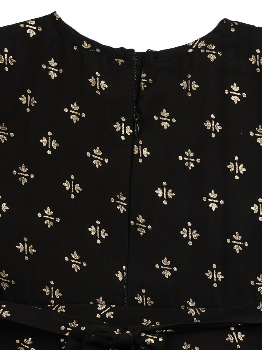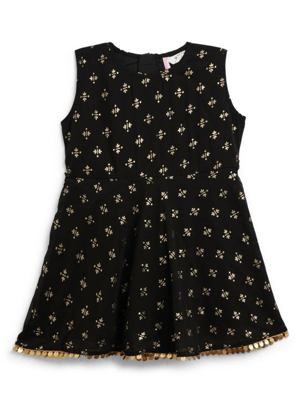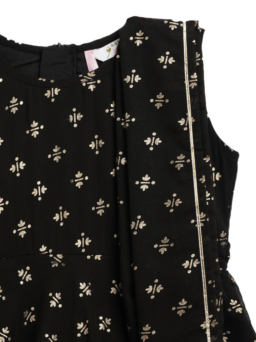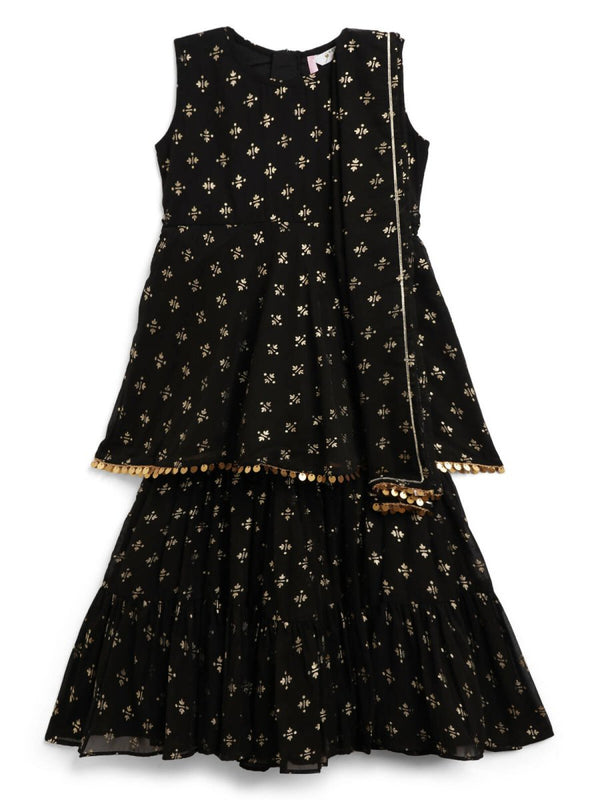 Ahalyaa Black Georgette Gold Foil Print Kids Peplum style Kurta Sharara Set With Dupatta For Girls