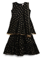 Ahalyaa Black Georgette Gold Foil Print Kids Peplum style Kurta Sharara Set With Dupatta For GirlsPut forward your duaghter's best traditional look...