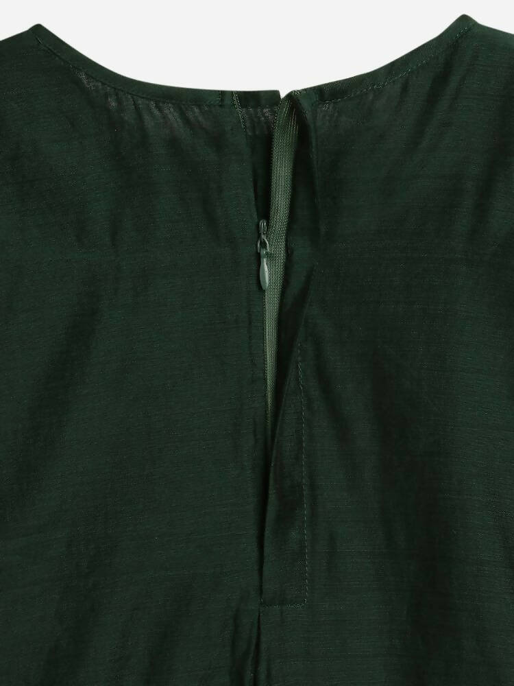 This clothing set consists of a kids girl Kurta Palazzo set with Dupatta. Dark Green Chanderi Crepe Solid Kurta, has a Round Neck and 3/4th Sleeve, Side Pocket In Kurti. Dark Green Chanderi Crepe Solid Straight Palazzo. Gold Glitter Print Dark Green Colour Net dupatta. We have the perfect Kurta set for your little Girls that will make them look stylish & cute while still being comfortable. Let your Outfit be sorted for All Seasons. A Charmingly Trendy Look Awaits Your Little One On The Other Side Of Wearing This Outfit.