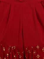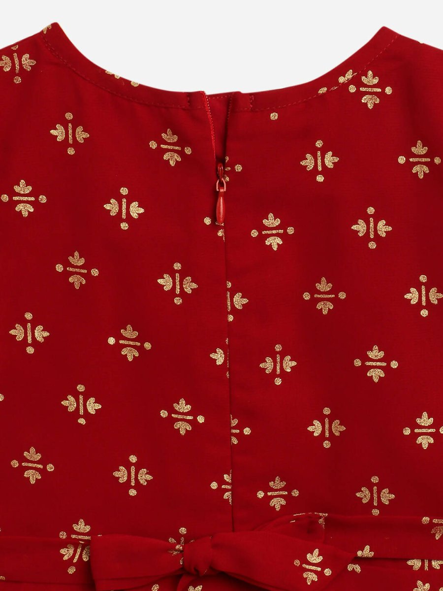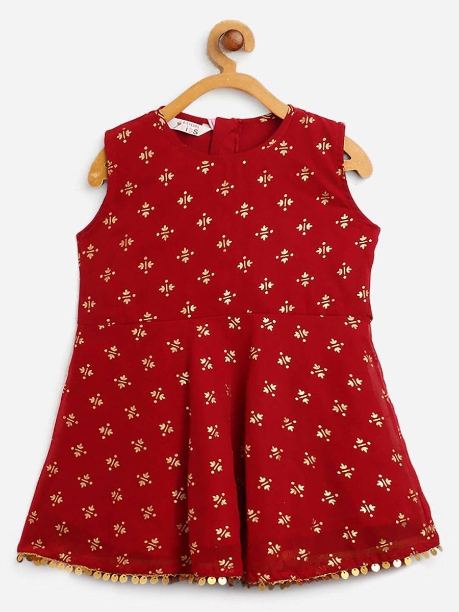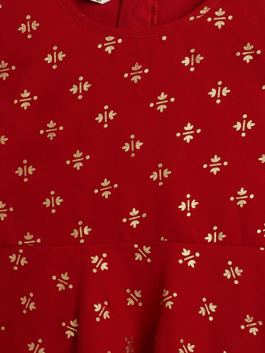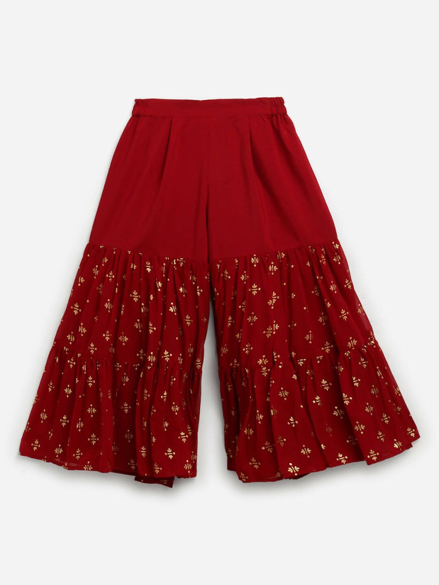 Ahalyaa Maroon Georgette Gold Foil Print Kids Peplum style Kurta Sharara Set With Dupatta For Girls - 2-3Y
