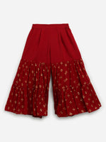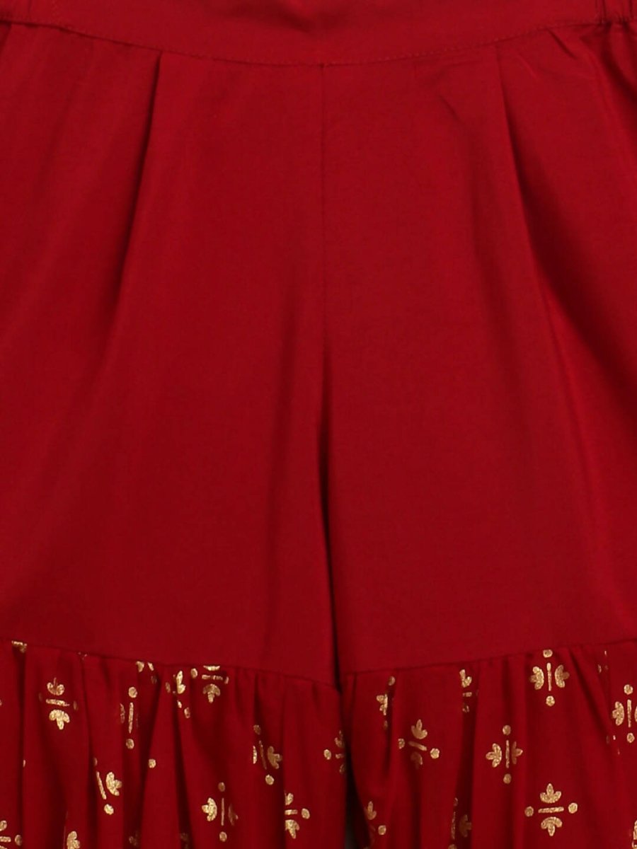 Ahalyaa Maroon Georgette Gold Foil Print Kids Peplum style Kurta Sharara Set With Dupatta For Girls